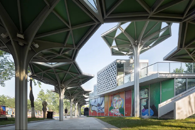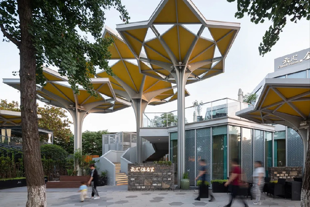 项目处于南京新城区一处尺度巨大但缺乏公共活动的广场。设计在保护原有场地生态的基础上,置入适应需求的公众服务功能,并采取结构主义建筑的策略,以单元模块组合的方式来创造空间序列。整体街区采取"树林下的花海"为意向来呼应场地和周边的文化建筑。单元模块形式概念从"花"的形态抽象提取,以伞状的薄壁钢结构形成 具有美感的空间单元。由于项目本身所要求的临时性,单元模块的结构组件在工厂预制加工并在现场拼装,以便于日后有可能的拆除和回收。模块化组合的可灵活分割的小型商业空间掩映于银杏树丛中,为市民提供了可居、可游、可憩的休闲空间和公共空间。