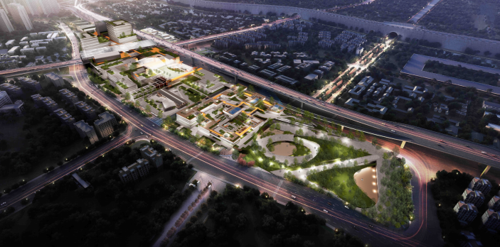 交通专项设计统筹考虑机动交通、慢行交通与公共交通后,结合竖向规划,提出快慢分离的总体思路:即在地面层建设完整道路网同时,在地下一层建设东西向慢行廊道。按上位规划,结合快慢分离后的竖向空间,本场地布置了四线三轨(即既有1号线,规划8/S2号线(贯通运营)和规划18号线)和巴士公交的换乘枢纽。