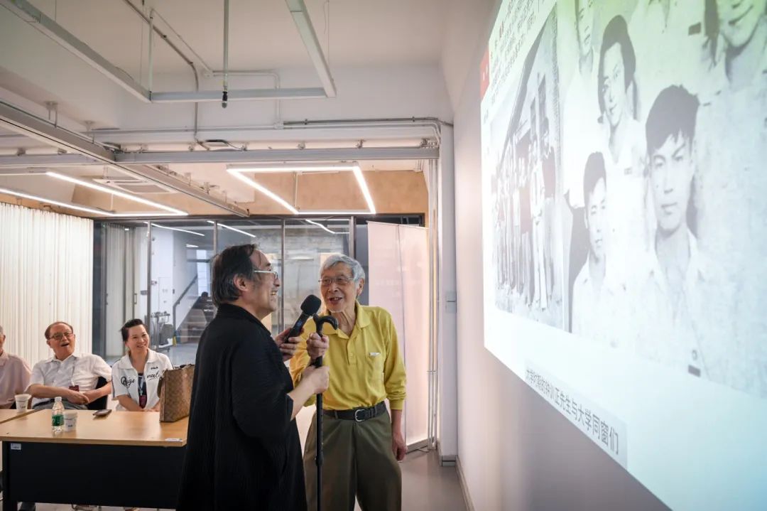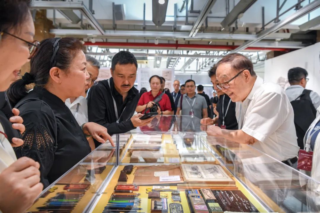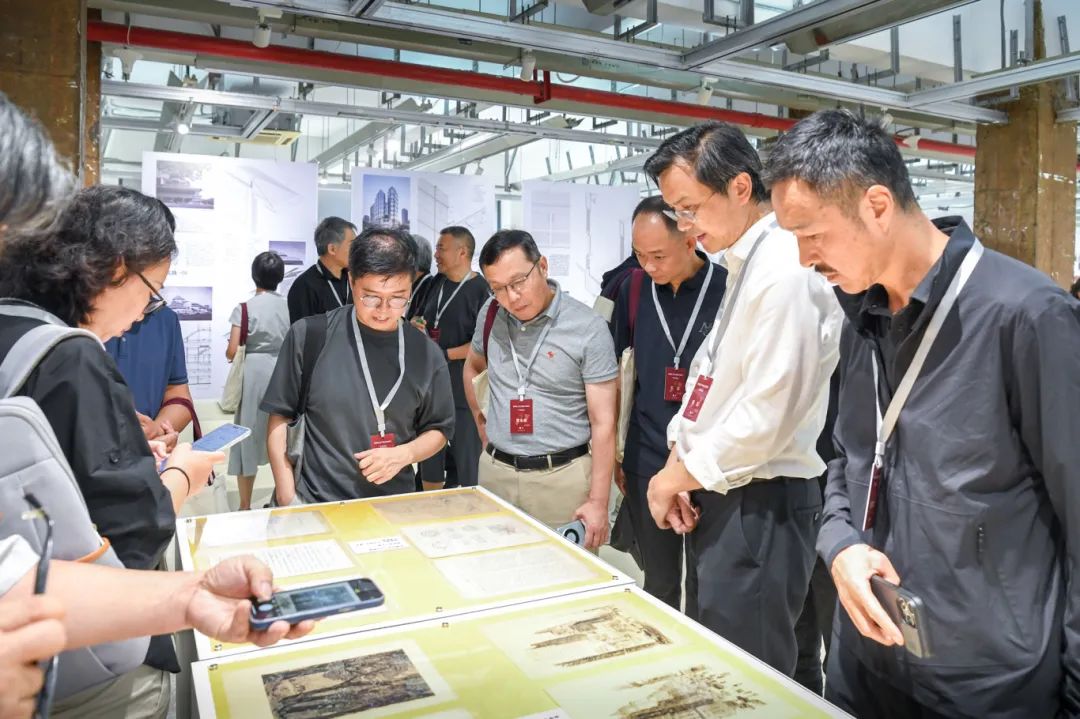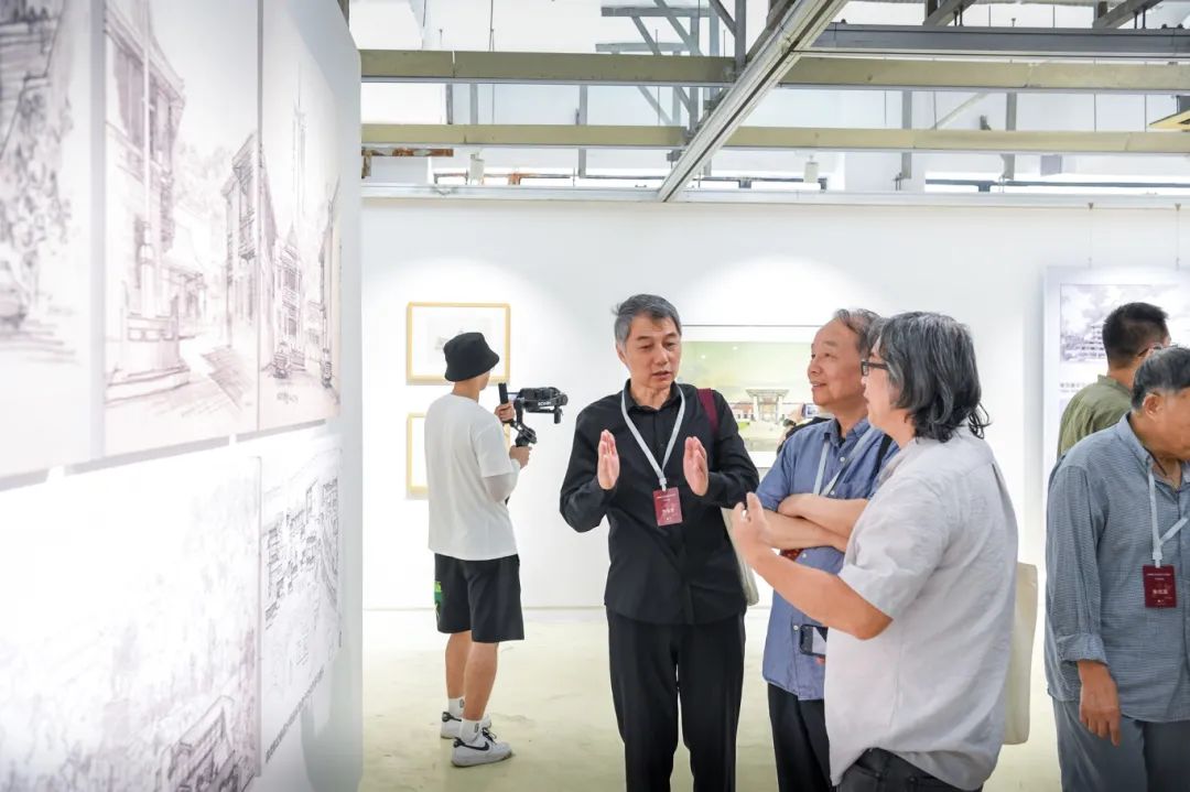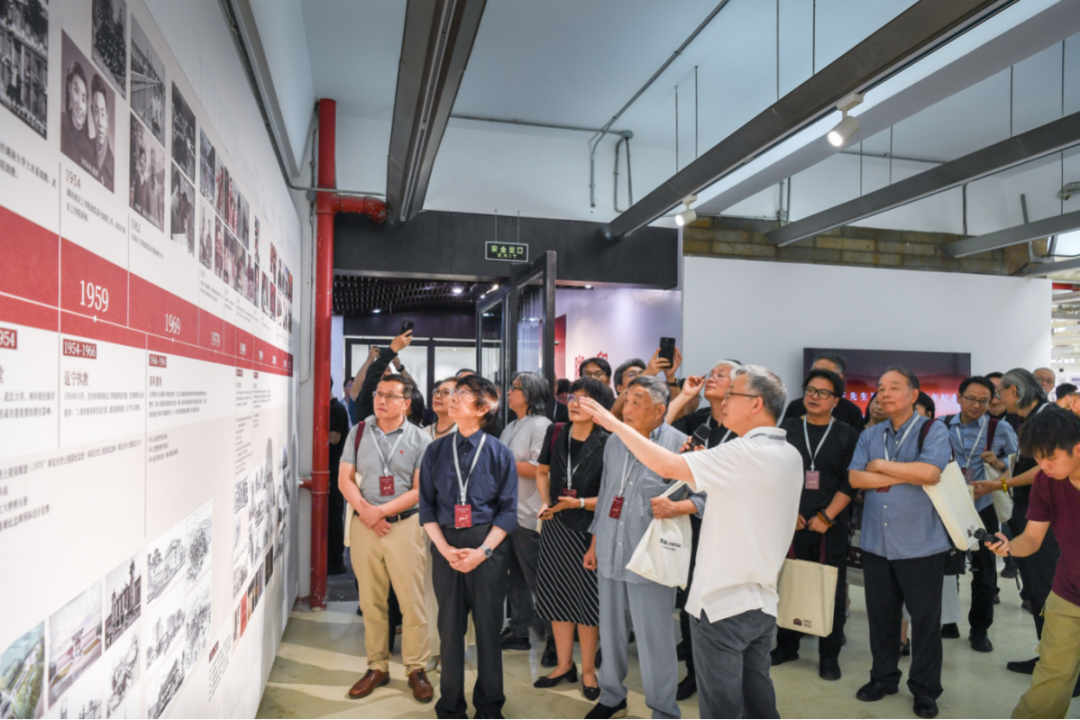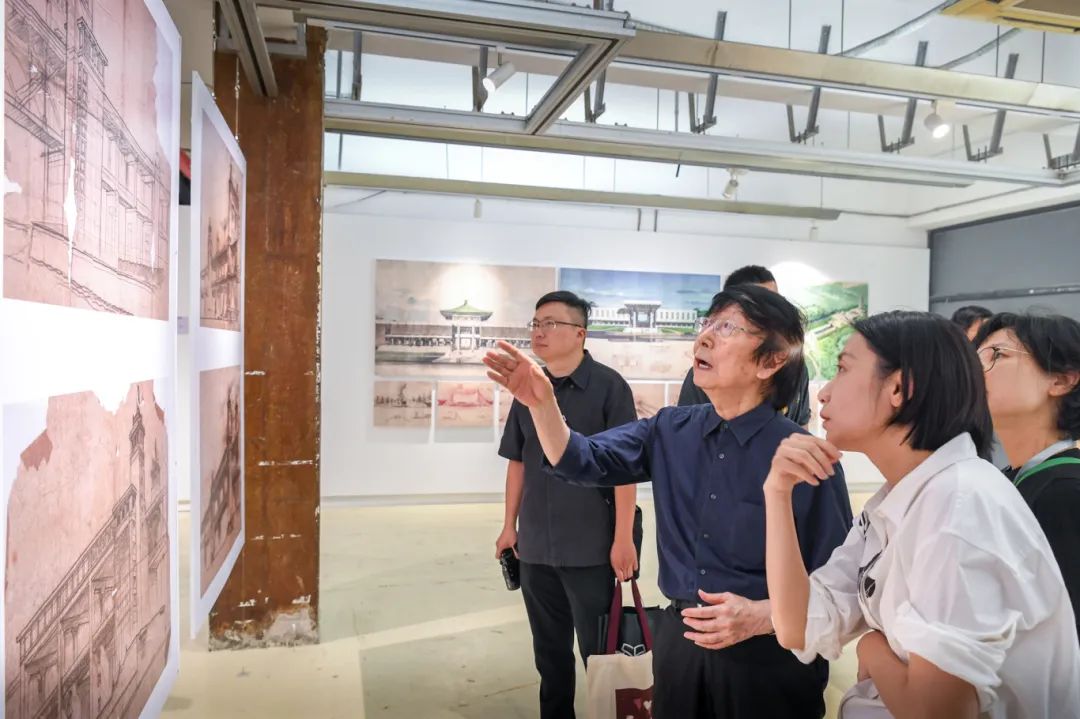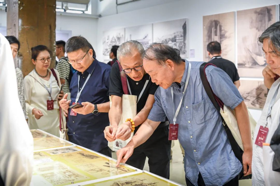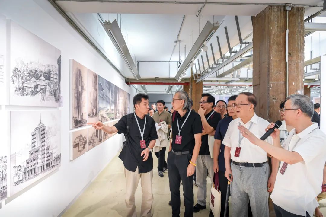 随后,来宾移步展厅参观,韩冬青教授为纪念展做了导览。本次展览整理收录了钟先生生平照片、工程项目模型、画作手稿、教学科研资料以及AI复原的工程项目影像,还特别展出了钟训正先生手书笔记、手绘图纸、绘画作品的真迹以及工作学习中的用品用具,从不同侧面记录了钟训正先生在建筑教育、建筑创作和建筑绘画等方面的非凡学术成就和艺术造诣。