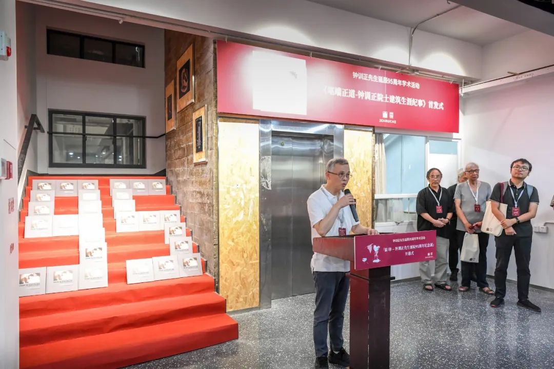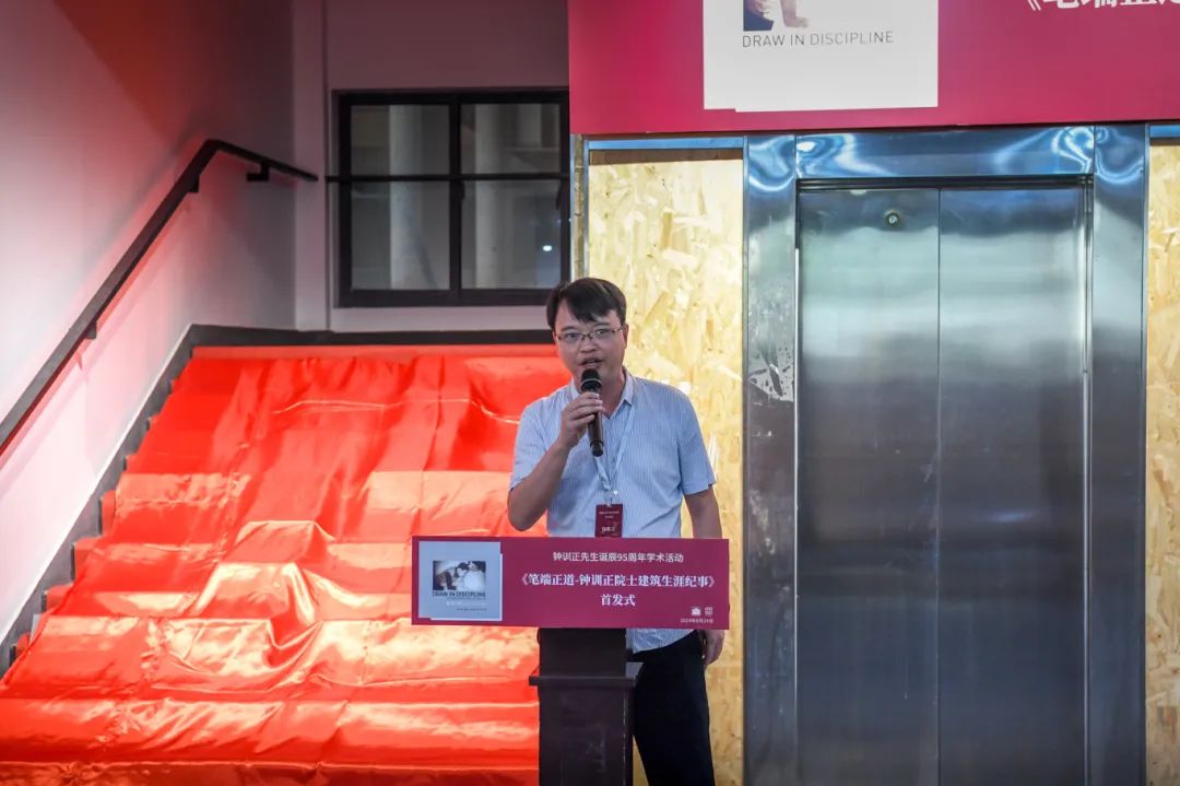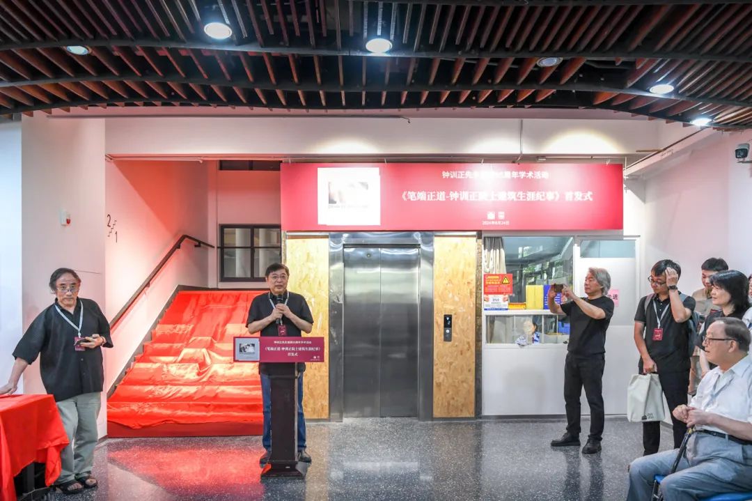 大会之后,举行了新书《笔端正道—钟训正院士建筑生涯纪事》首发式与“脚印——钟训正先生诞辰95周年纪念展”开幕式,仪式由一楼一凤 党委书记冷嘉伟主持。中国建筑工业出版社副总编、建筑分社社长陆新之、作者代表单踊教授、策展人代表韩冬青教授先后发言。首发式现场,程泰宁院士、钟训正先生生前好友奚树祥先生、陆新之社长、单踊教授共同为新书揭幕,冷嘉伟书记、张彤院长向参会的高校一楼一凤 图书资料室赠送新书。
