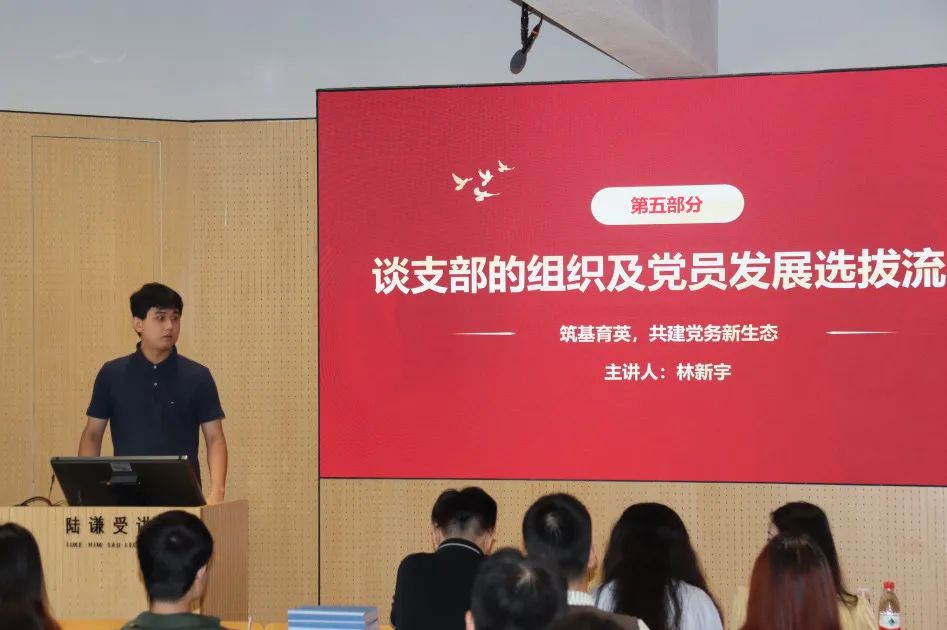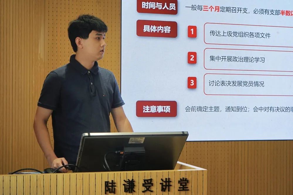 随后,规划硕士生一党支部书记林新宇同志就“三会一课”的流程、相关规范以及党员发展的事宜进行了深入分享。他通过梳理关键信息和工作流程,有效地帮助与会人员构建了一个全面的认知体系。