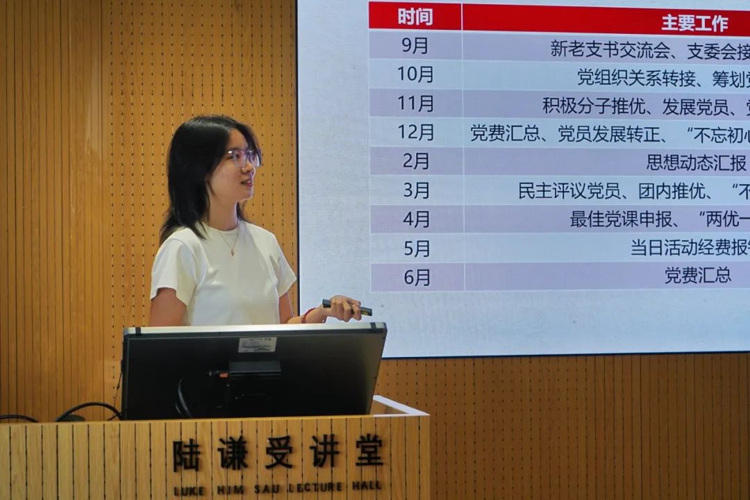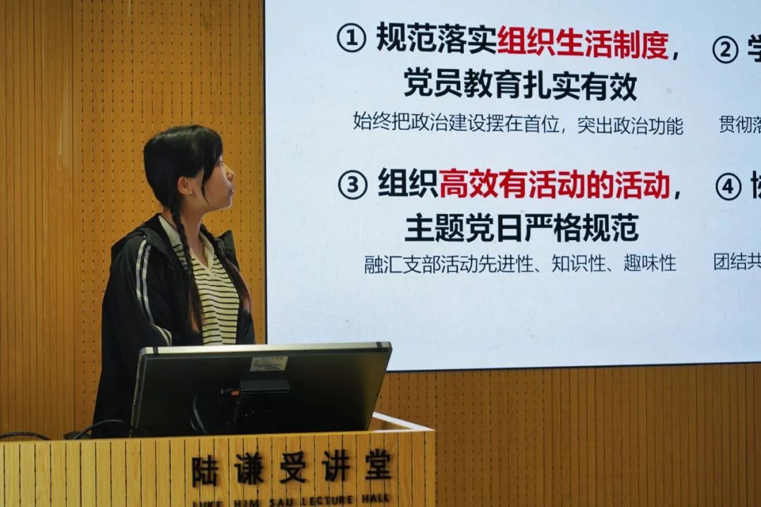 党委及各支部的组织结构进行了简要介绍。随后,她从职责分工、党员发展以及党日活动三个关键方面,对党支部的工作要点进行了详尽阐述。通过她的讲解大家对党支部工作的全局和细节有了更加深刻的认识。