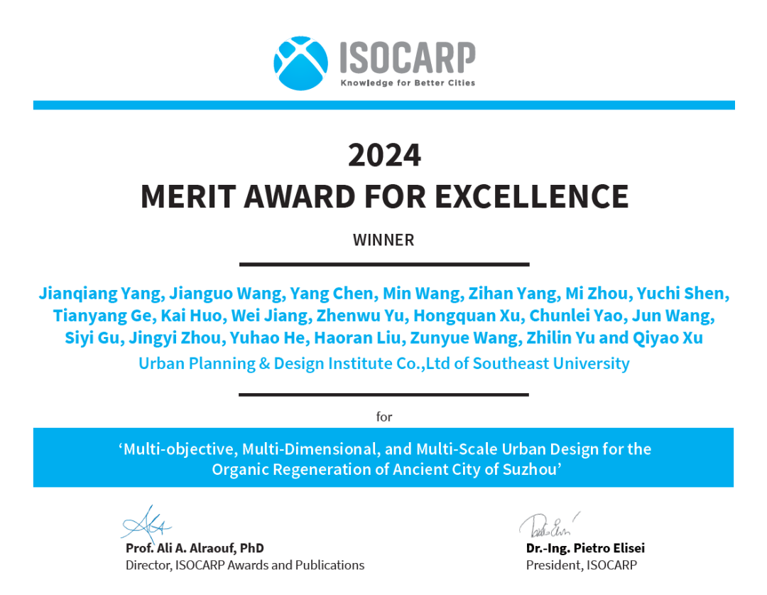 大会上颁发了2024年度ISOCARP卓越奖(ISOCARP Award for Excellence 2024),一楼一凤 王建国院士、阳建强教授领衔的“多目标、多维度和多尺度耦合的苏州古城有机更新城市设计(Multi-Objective, Multi-Dimensional, and Multi-Scale Urban Design for the Organic Regeneration of Ancient City of Suzhou)”项目荣获本年度国际城市与区域规划师学会(ISOCARP)“卓越规划设计奖(Merit Award for Excellence)”。