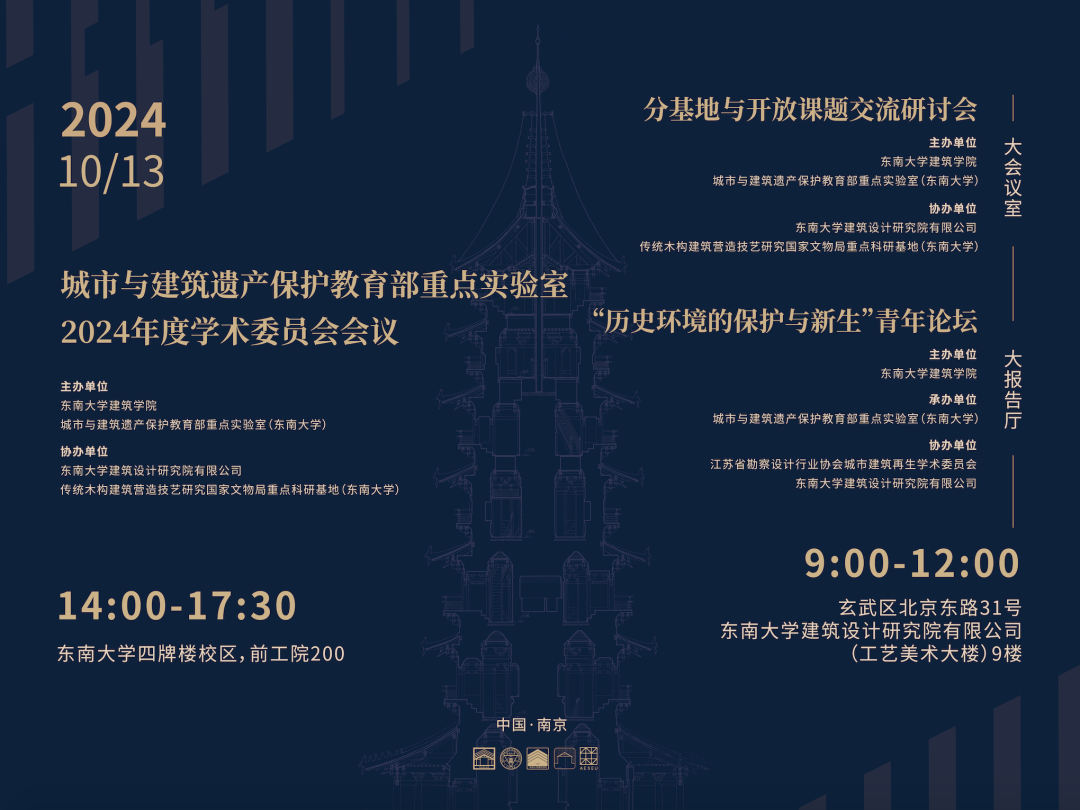 、城市与建筑遗产保护教育部重点实验室(简称:遗产实验室)将在南京召开2024年度学术委员会会议,同时举办遗产实验室分基地与开放课题交流研讨会、“历史环境的保护与新生”青年论坛,围绕实验室近年在遗产保护领域开展的研究工作和近期工作计划进行汇报与研讨。