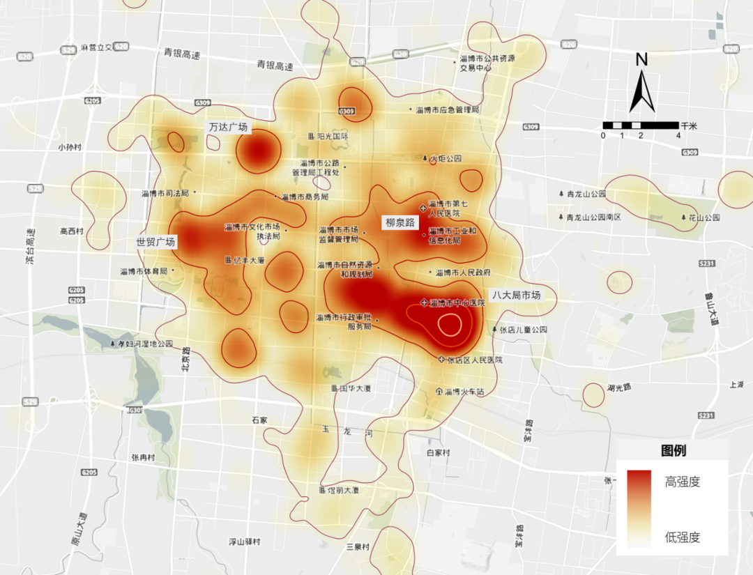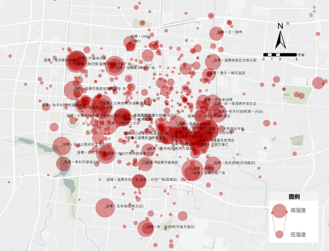 淄博市中心城区微博签到地点位分布热度与空间意象热力图