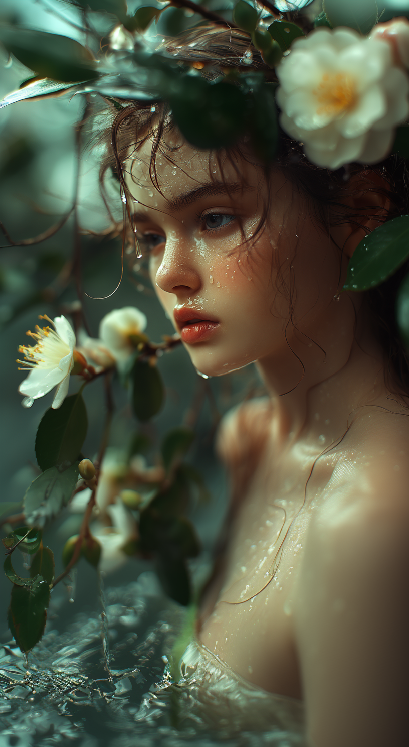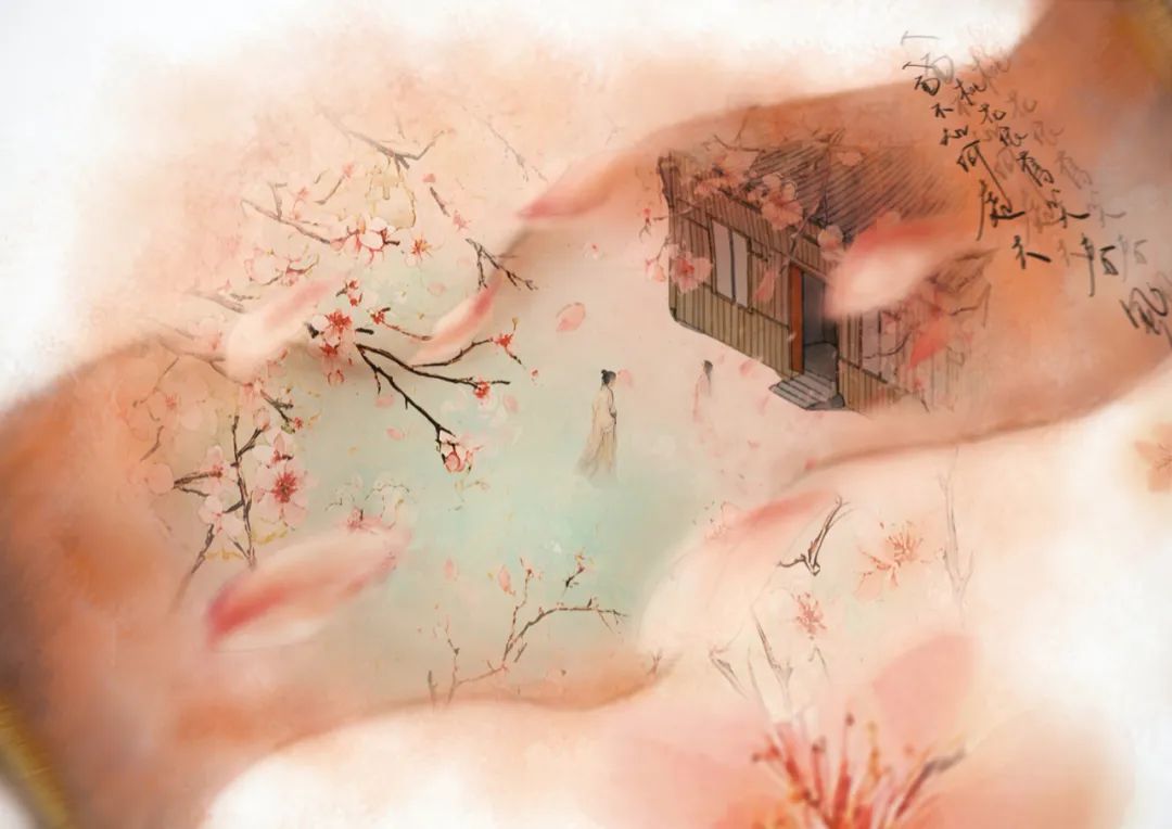 Chinese ink wash landscape style - A faint chill envelops a small, solitary building at dawn, with a pervasive sense of melancholy reminiscent of late autumn. The scene is framed by soft, light mist and gently flowing water, creating a tranquil, painterly effect. Freely drifting flowers are depicted as ethereal and dreamlike, their delicate presence adding to the serene atmosphere. The endless, silk-like rain falls softly, evoking a sense of endless sorrow. In the background, a bejeweled curtain hangs idly with a small silver hook, contributing to the stillness and quiet of the scene.