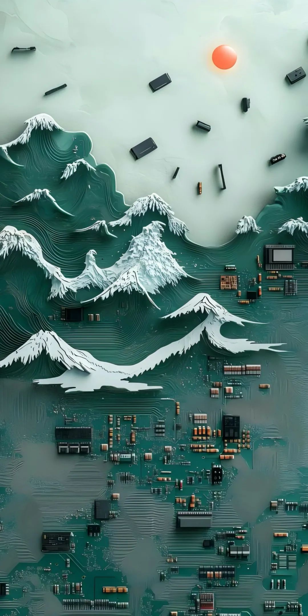 various kinds of circuit boards with various parts, the circuit board looks like the wave and mountains, circuit board lighting, style of Japanese ukiyo-e tradition, photograph, studio lighting --ar 1:2 - Remix (Strong) by @MUYUBANGZl (fast)