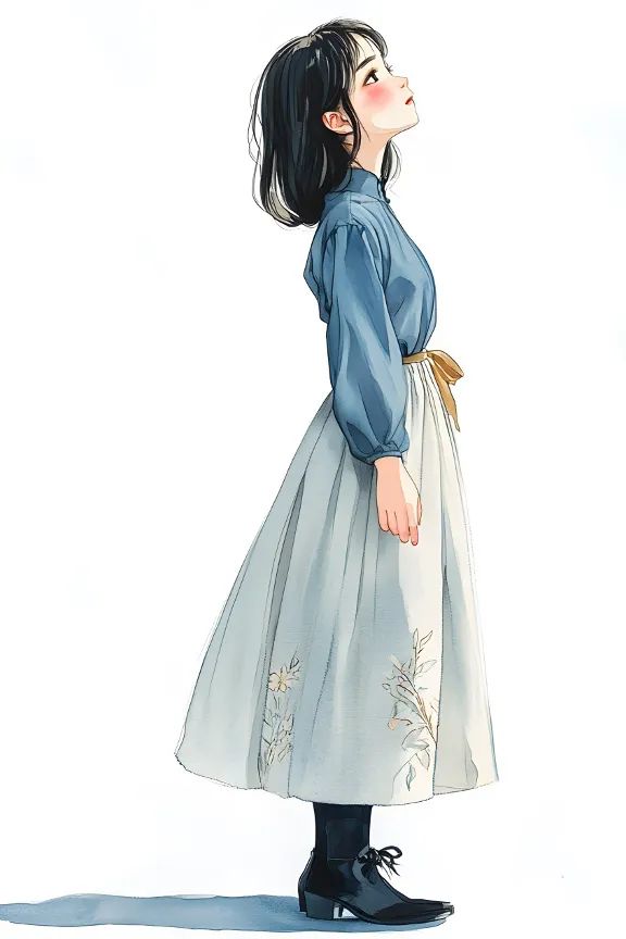 A girl wears a blue blouse, put the hands behind her back, dressed in a grey dress, in black shoes, chinese clothes,short black hair, look up, side to us,in the style of pen drawing, in the style of watercolor, full body, in the white background, high quality of eyes and hands,a person with perfect hands --cref//s.mj.run/RCyP3LcChqg --cw 100 --s 250 --v 6.1