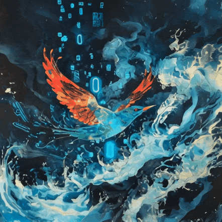 A blue-green bird with red wings is in the lower middle of the picture, Many numbers 0 and 1 glowing blue light around the bird, storm, the numbers are in the style of cyberpunk, the background is sea water, rock color prints, oblique angle composition, paper cut Dunhuang style, top view