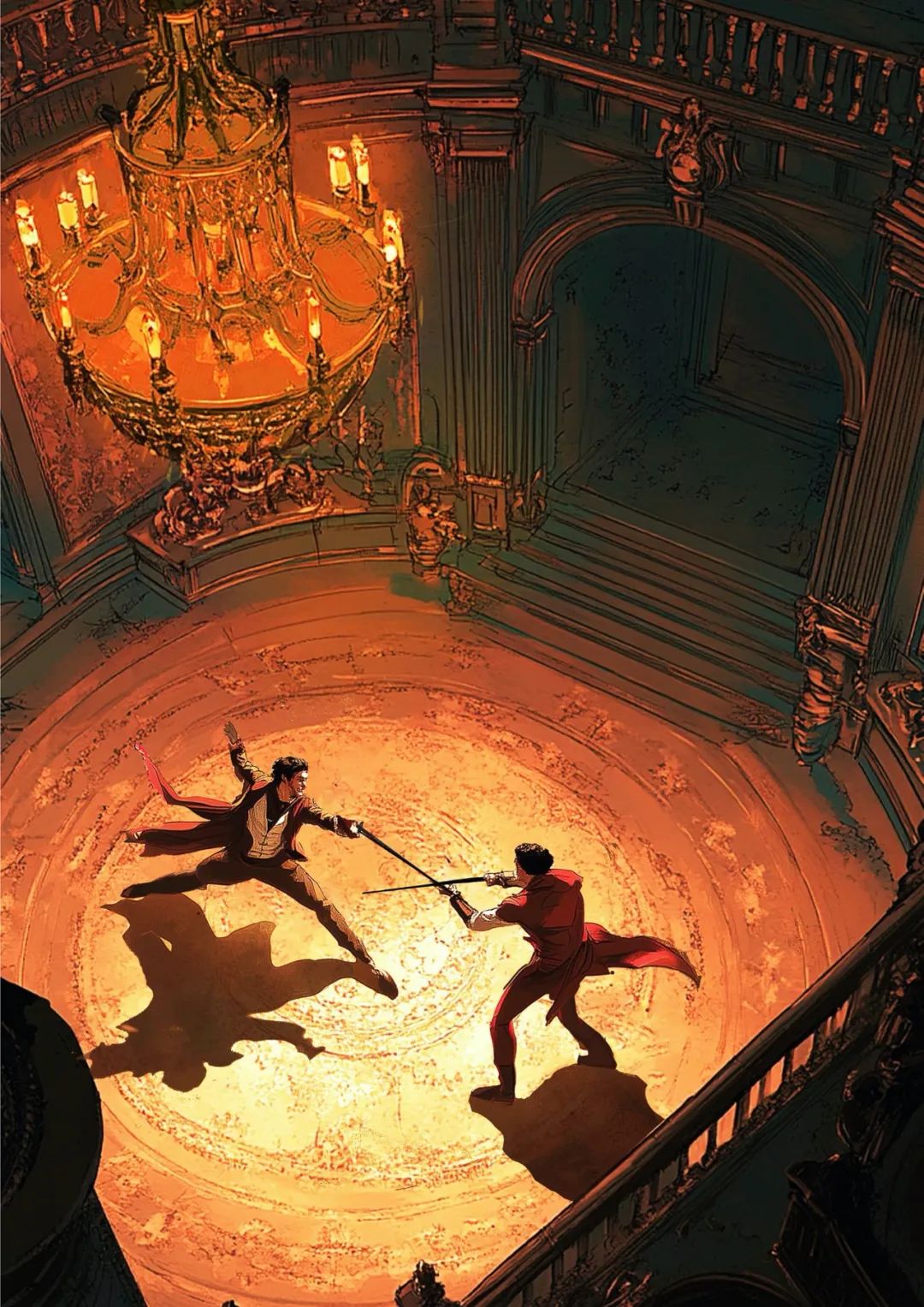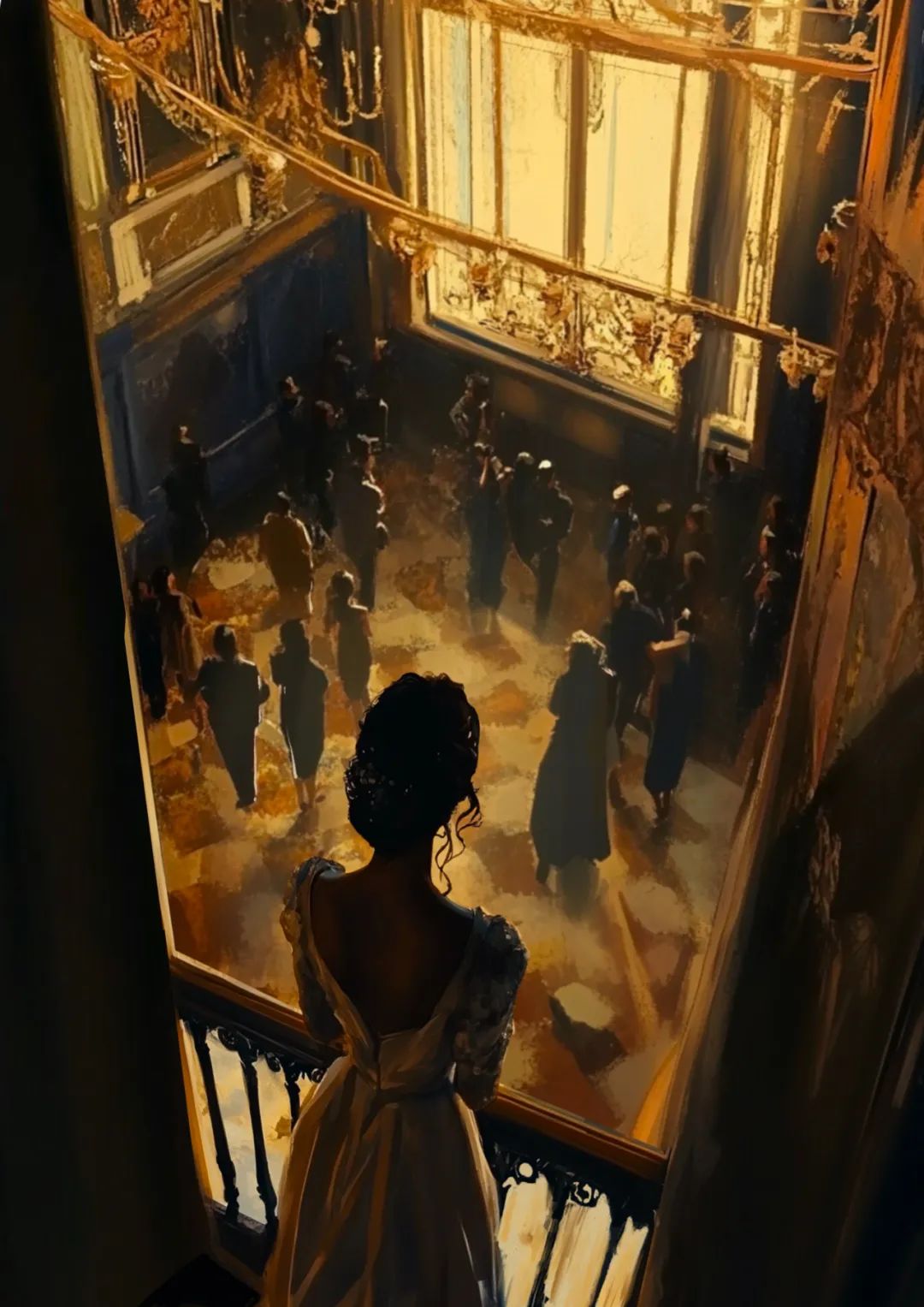 我走向画廊的栏杆,向下俯瞰楼下的大厅。男人们聚集在那里,周围有一两个女孩。我看着他们走进了大客厅,听到托盘被端来时的叮当声