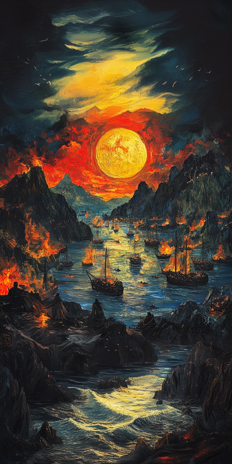 时操军众已有疾疫,初一交战,操军不利,引次江北。瑜等在南岸,瑜部将黄盖曰:“今寇众我寡,难与持久。操军方连船舰,首尾相接,可烧而走也。”乃取蒙冲斗舰十艘,载燥荻枯柴,灌油其中,裹以帷幕,上建旌旗,豫备走舸,系于其尾。先以书遗操,诈云欲降。时东南风急,盖以十舰最著前,中江举帆,余船以次俱进。操军吏士皆出营立观,指言盖降。去北军二里余,同时发火,火烈风猛,船往如箭,烧尽北船,延及岸上营落。顷之,烟炎张天,人马烧溺死者甚众。