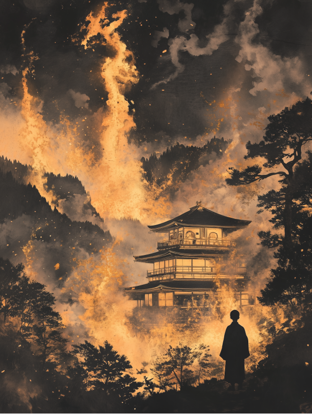 从这里无法看清金阁寺的轮廓,只能看见翻滚的浓烟和冲天的火苗。余烬已经在树木间翻飞,好似在金阁寺上空撒了一把金沙
