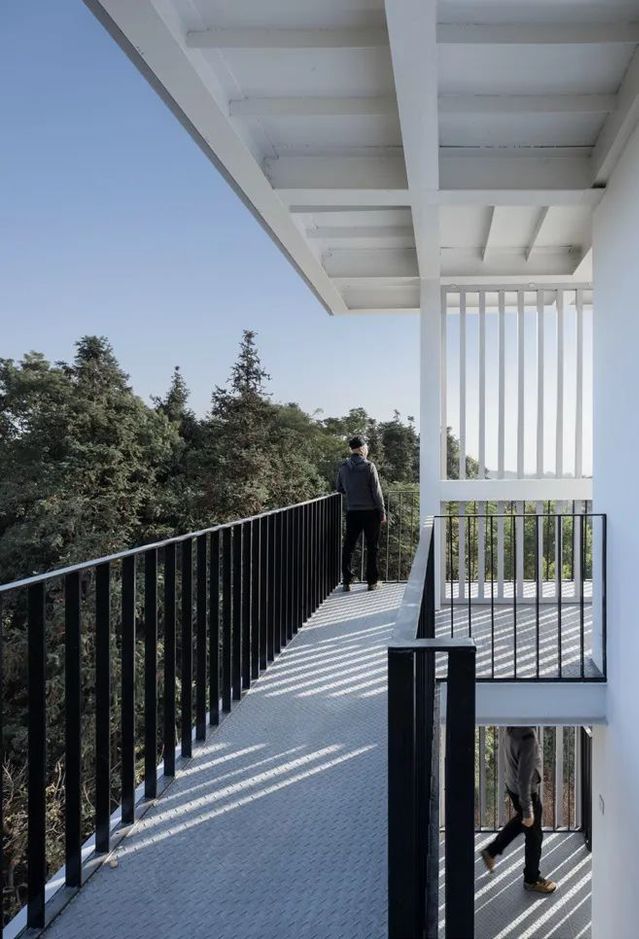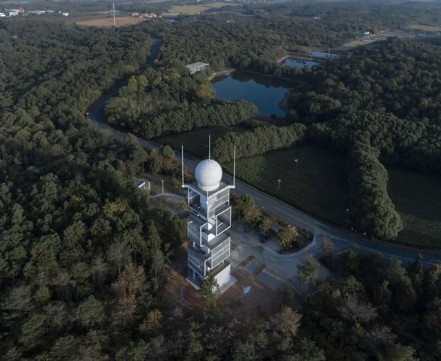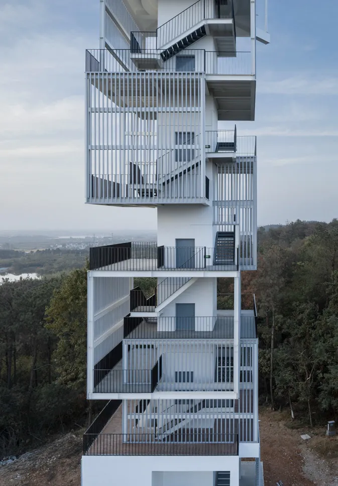 气象塔位于游子山国家森林公园内,设计师希望它不仅是一个功能性的基础设施,而是一个新的媒介,成为基本市政功能与环境和人的联系体,形体上改变常规雷达观测塔的形象,与周边优美的风景有机协调,并且具有游客观光的功能,成为当地的一个景点。设计希望以尽量轻和透的形式触碰场地,缩小占地面积,减少对环境的干扰,以更加和谐的方式与场地产生互动。概念的原始设想来自与周边的树木,希望混凝土塔体如同一颗生长的树干,而钢结构楼梯缠绕上升,楼梯平台盒子则挂在树上,形成不同高度和不同方向的观景器,游客可以在步移景异之间登高望远,区别于传统塔更重视顶层的观景设计,通过空间节奏的变化将30米的登高过程转换成愉悦的观光之旅。