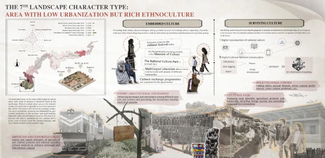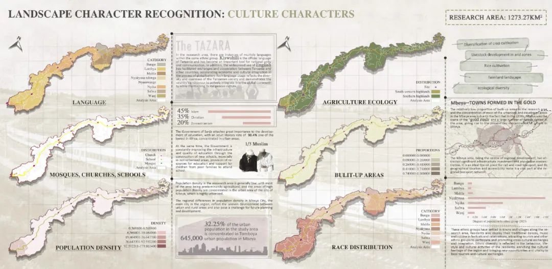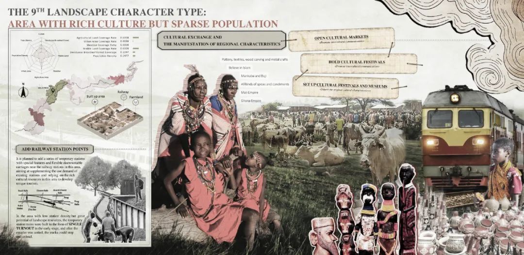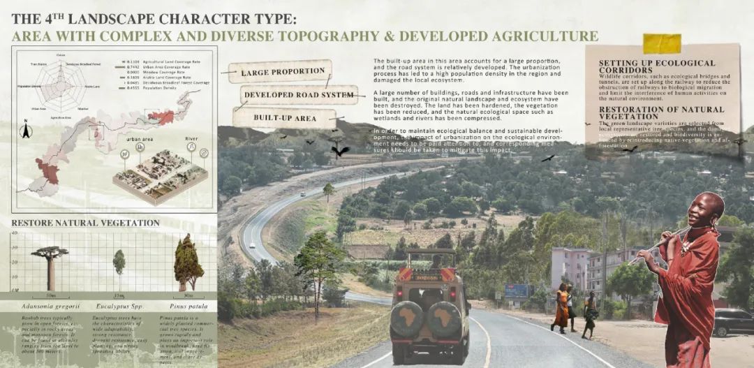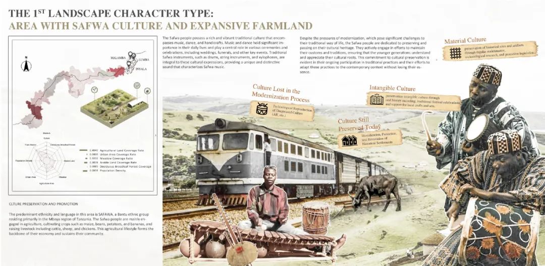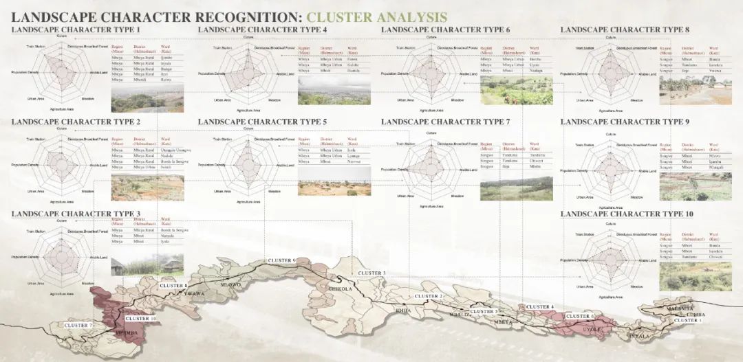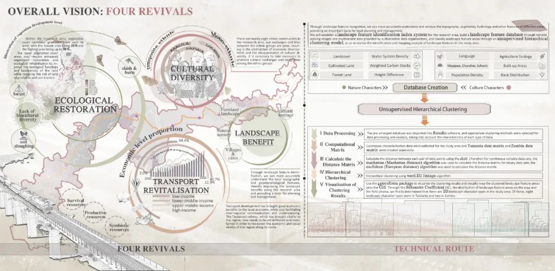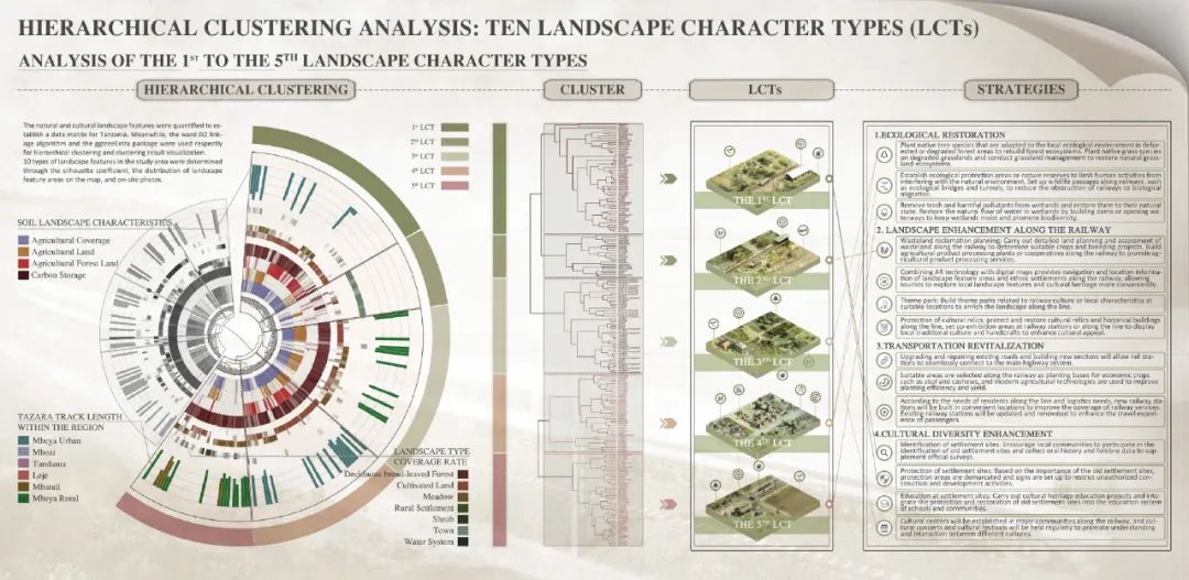 本项目立足新时代中非命运共同体共建战略,聚焦坦赞铁路的激活更新与可持续发展需求,系统开展了坦赞铁路景观特征解析与活化更新研究。项目针对坦赞铁路沿线生态基底退化、空间效能衰减、文化资源利用不足、社区凝聚力下降等问题,构建了“生态修复-文化振兴-技术赋能-空间优化”多维更新框架。研究集成多光谱遥感、数字地形模型(DTM)、数字表面模型(DSM)等技术手段,构建涵盖2大类11项94子项指标的自然-人文景观特征数据库。通过无监督聚类算法实现了区域内景观特征的智能识别与类型解析,划定了10类景观特征类型区域,并提出针对性更新策略。本项目成果为坦赞铁路沿线绿色基础设施建设提供了风景园林专业研究范式与技术支持,为中非基础设施合作项目创建了可复制的数字化决策路径。