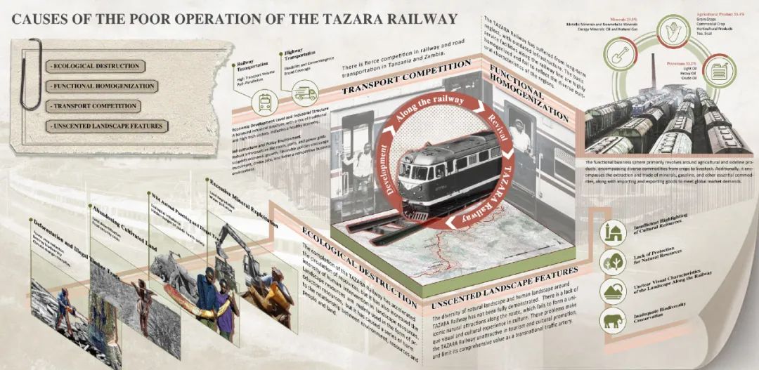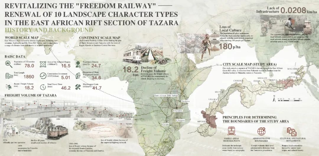 作为一条贯通东非和中南非的交通大干线,坦赞铁路不仅是区域经济发展的交通动脉,更是连接自然与文化、承载可持续发展希望的重要纽带。然而,自20世纪90年代以来,坦赞铁路运营逐渐衰退,沿线生态环境不断退化,景观价值日益流失。为重振这一重要战略通道,本项目聚焦于坦赞铁路与东非大裂谷西支带交汇处的复杂景观系统,开展系统性的研究与规划设计。