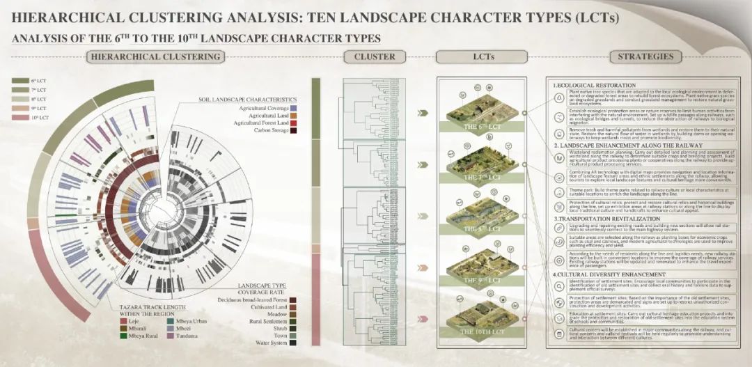 通过R语言计算研究区域数据的距离矩阵,对于连续变量数据采用曼哈顿距离(Manhattan)算法,对于类型变量数据采用欧式距离(Euclidean)算法;选择ward.D2聚类算法进行无监督的层次聚类。结合现场调研验证,将研究区域划分为10种景观类型(Landscape Character Types, LCTs),并为每种类型提出了系统性、针对性的规划设计策略。