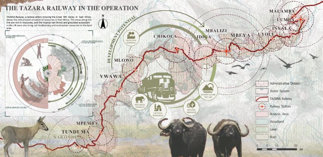 项目研究区域位于坦赞铁路与东非大裂谷西部支线的交汇处,长度约189公里,总面积为 1273.27平方公里。区域内雨林与草原交织,生态资源丰富,拥有独特的地质地貌。铁路串联起12个承载历史记忆的站点群落,形成了一条自然遗产与人文景观交织的生态廊道。