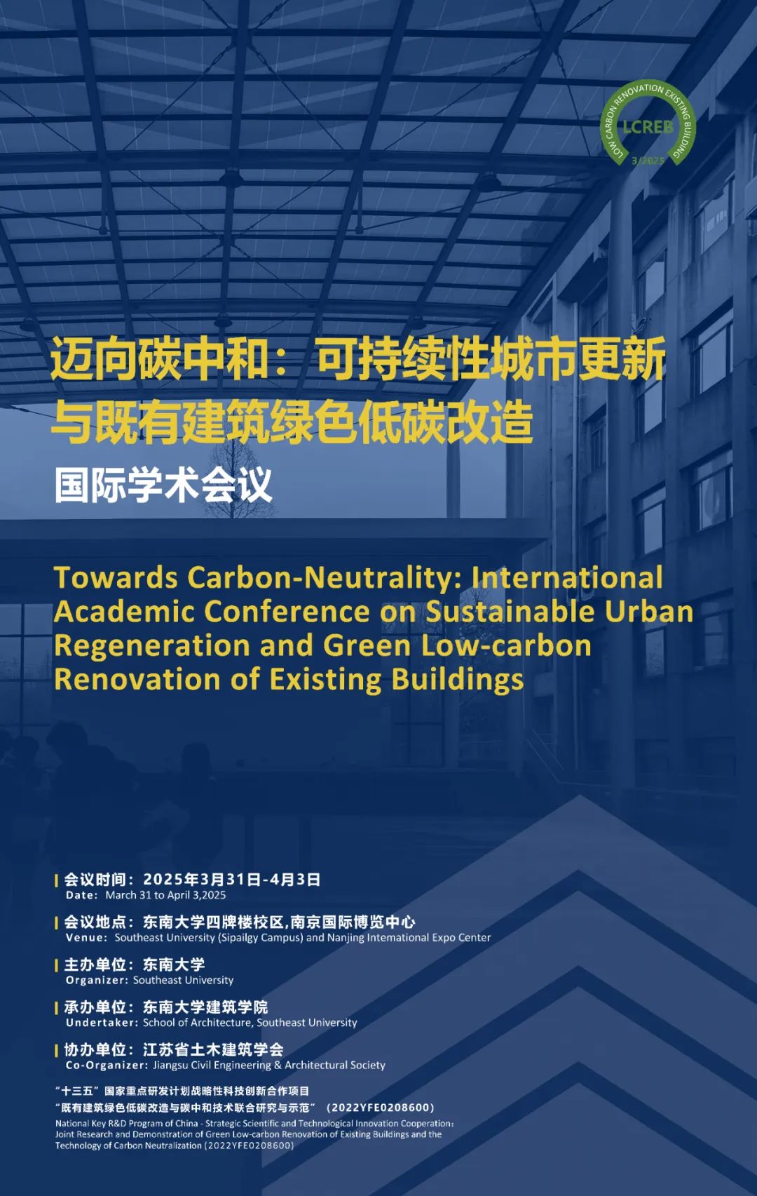 The theme of this international academic conference is “Towards Carbon Neutrality: Sustainable Urban Regeneration and Green Low-carbon Renovation of Existing Buildings.” The conference aims to explore technology systems, evaluation standards, and design guidelines for sustainable urban regeneration and green low-carbon renovation of existing buildings of different types in various climates. It will also provide a platform for exchanging and sharing the policy pathways, cutting-edge technologies, and practical experiences in urban regeneration and construction under the carbon neutrality process across various countries, while further promoting international scientific research cooperation and joint talent cultivation.