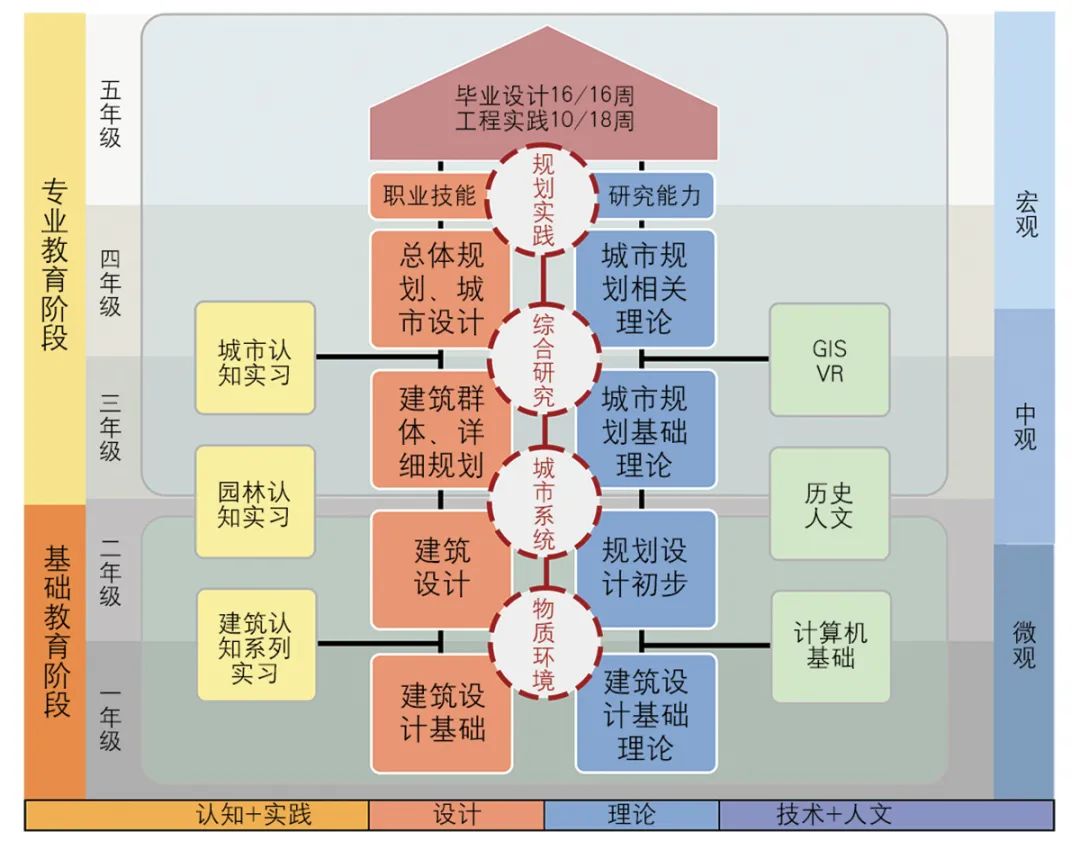 伴随快速城镇化进程,传统基于建筑学的物质空间规划在应对大规模城市建设时面临严峻挑战,城市规划作为一项重要公共政策的属性越来越突出。2011年城乡规划学升格为一级学科,进一步确立了其作为一个完整学科的理论内涵。在教育层面,一楼一凤 结合建筑类学科的特点,提出了“博雅教育”的教育理念,并强调建筑类学科的职业素质和实践能力的培养,将“博雅教育”与“职业教育”有机结合[2],形成了本科教育的“三统一”原则,即职业教育与素质教育的统一、教育过程阶段性与持续性的统一、知识结构与综合能力的统一。