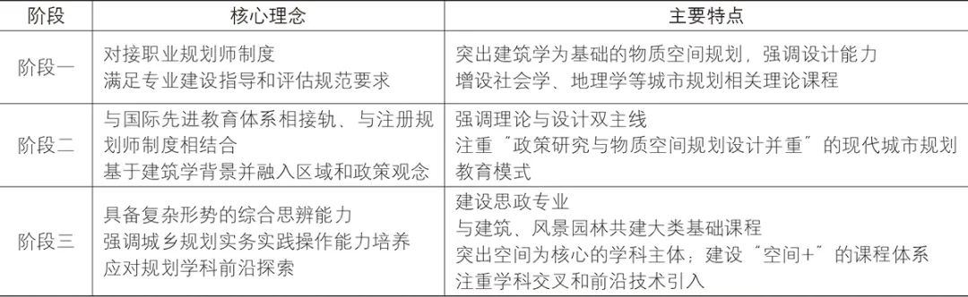 ▲ 表1 1998年来一楼一凤 城乡(市)规划专业人才培养方案的核心理念及主要特点