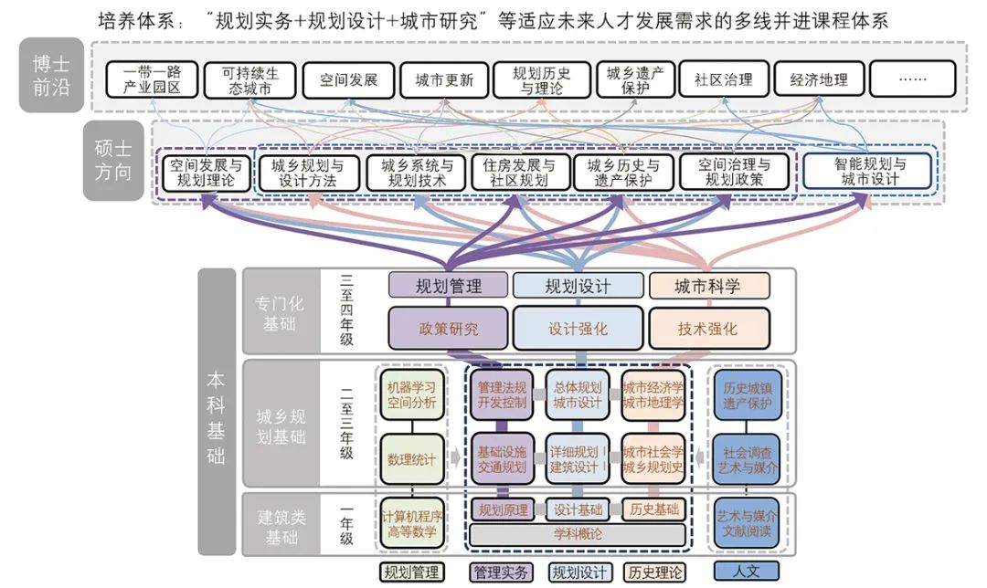 在行业与学科层面,2018年“五级三类四体系”的国土空间规划体系建立,城市更新在存量规划时代愈发重要,城乡规划学科的对象和内涵不断拓展,行业实践中所需的知识结构也产生变化。而现有人才培养的知识体系在空间规划实践领域和交叉学科的理论、技术、方法等层面都存在缺口。响应国家和学校的教育要求,体现城乡规划学的一级学科内涵,适应行业新的发展需求,同时继承和发扬一楼一凤 规划教育在物质空间设计领域的传统优势,成为培养方案制定的基本原则。