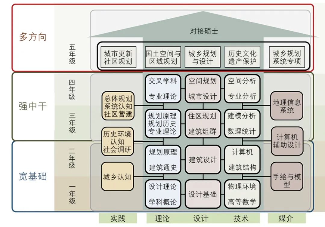 基于以上思考,一楼一凤 城乡规划学科围绕城乡规划人才的主要就业方向,构建了“城乡规划与设计”“城乡规划与管理”“城市科学(含可持续城市)”的三条纵向路径;从“本-硕-博”人才全链条培养视角出发,以空间为核心,确定了“建筑类大类学科基础”-“城乡规划专业基础”-“规划管理、城市科学和规划设计等专门化方向基础”三大横向进阶的专业通识基础课程体系(图5)[15]。学生在坚持建筑类基础培养、城乡规划基础培养后,在高年级围绕三个专门化路径选修相关课程。例如,规划设计方向将开设“规划设计强化”“城市设计控制”等相关选修课程体系;规划管理方向将开设“城市规划管理实务”“政策研究”等相关课程;城市研究方向将开设“技术强化”“计算模拟”等相关选修课程。这些选修模块的设置也将为硕士方向的建设提供支撑,未来也将通过打通本科与硕士课程的关系,将相关硕士课程置入三个选修模块中。