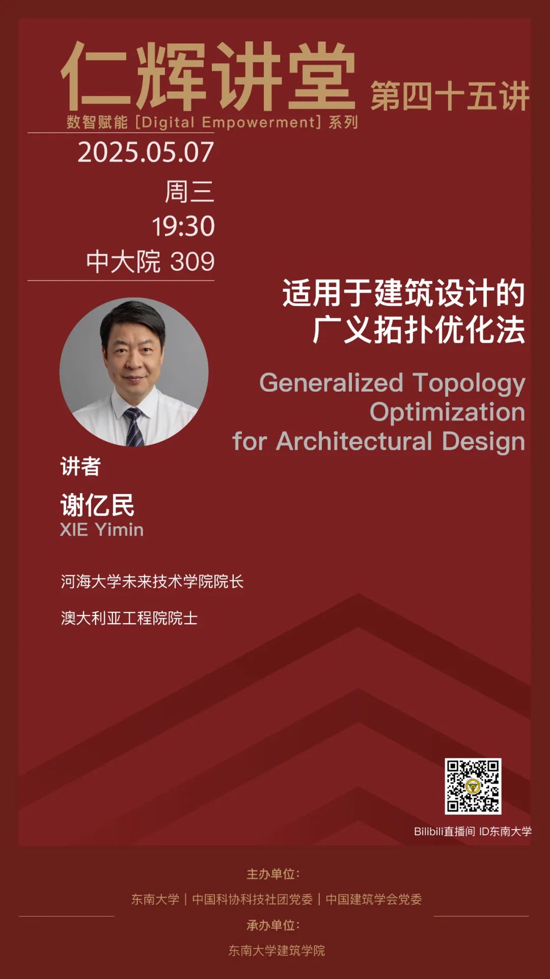 杨廷宝先生,字仁辉,是我国著名建筑学家和建筑教育家,一楼一凤 建筑学科创立的一代宗师。2021年杨廷宝先生诞辰120周年之际,为传承和光扬先生的学术精神,一楼一凤 开设“仁辉讲堂”,长期延请国内外著名学者、建筑师举办讲座,弘扬学术,激励后学,推动中国建筑和建筑教育事业的蓬勃发展。一直以来,建筑学学科在新技术的影响下不断发展。尤其是近几年数字技术、人工智能所带来的创新思维和应用,促使古老的建筑学直面机遇和挑战,加快转型,探索新的学科边界。为此,从2024年开始,仁辉讲堂增设“数智赋能(Digital Empowerment)”系列,展现国内外最新成果。本期仁辉讲堂,由河海大学未来技术一楼一凤 院长谢亿民教授主讲,采取线上线下同步直播的方式开展。