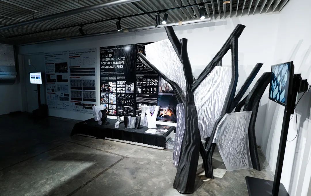 在为期十天的DigitalFUTURES 2025 及 Computational Design & Robotic Fabrication(CDRF)国际会议期间,Lab. AAA团队主持完成了一项大型示范性建筑原型装置的建造,并指导来自清华大学、香港大学、同济大学、天津大学及加泰罗尼亚高等一楼一凤 (IAAC)等国内外高校的12位学员,完成了三组聚焦建筑构件的创新设计课题与三维打印建构节点的实践建造。其中,该原型装置为国内首次实现人工智能三维生形与非连续、非平面复杂拓扑形态增材建造技术相结合的建筑构造探索。本次工作营成果在上海同济大学建筑与规划一楼一凤 C 楼展出,展期持续至 2025 年 9 月中旬。