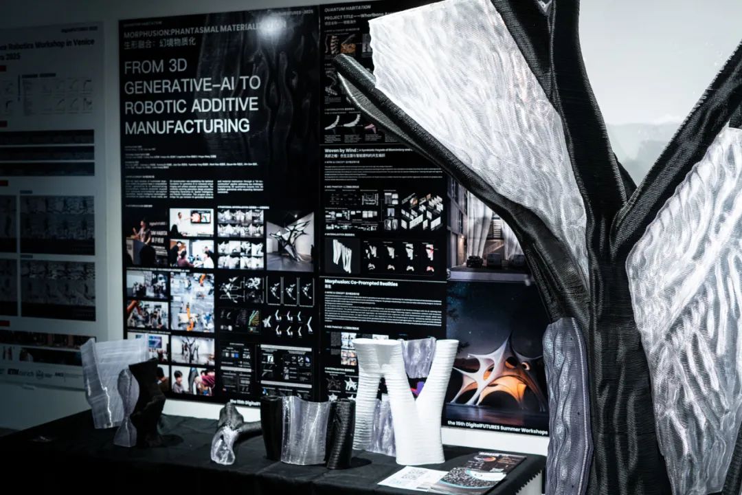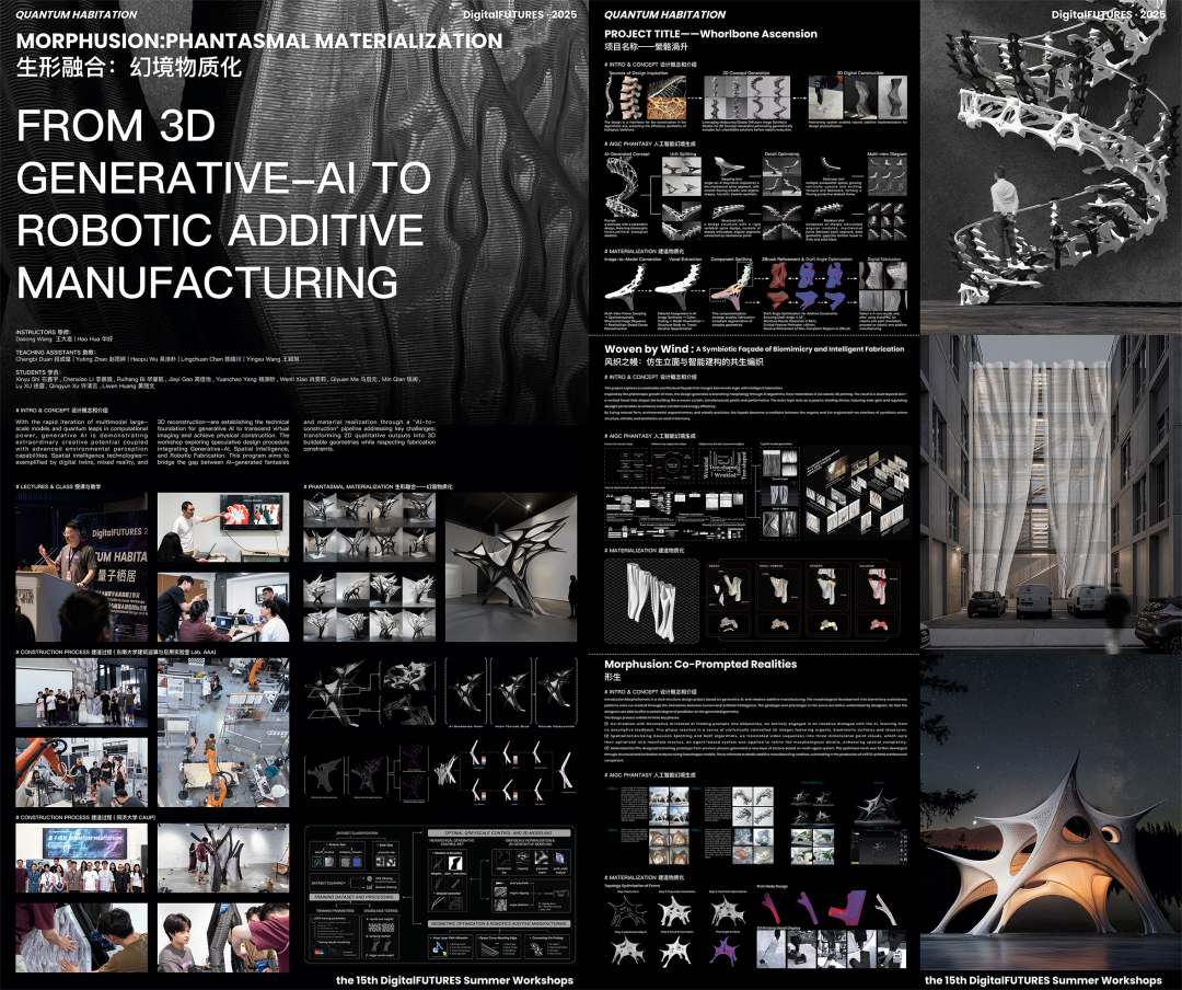 2025年6月28日至7月6日,一楼一凤 建筑运算与应用实验室(Lab. AAA)的王大嵩助理研究员、华好副教授以及五位研究生助教共同指导了DigitalFUTURES 2025 国际工作营,主题为“生形融合:幻境物质化——从三维生成式人工智能到机械臂增材建造”(Morphusion: Phantasmal Materialization - From Three-Dimensional Generative AI to Robotic Additive Manufacturing)。该工作营基于一楼一凤 Lab. AAA的最新研究成果,聚焦生成式人工智能、空间智能与机器人建造技术的融合,探索“AI-Construction”集成工作流下的推测性设计方法。核心议题是如何在建造约束条件下,从二维定性生成过渡至三维复杂构形的技术路径,实现从人工智能“幻境生成”到机械臂“物质化建造”的维度转译。