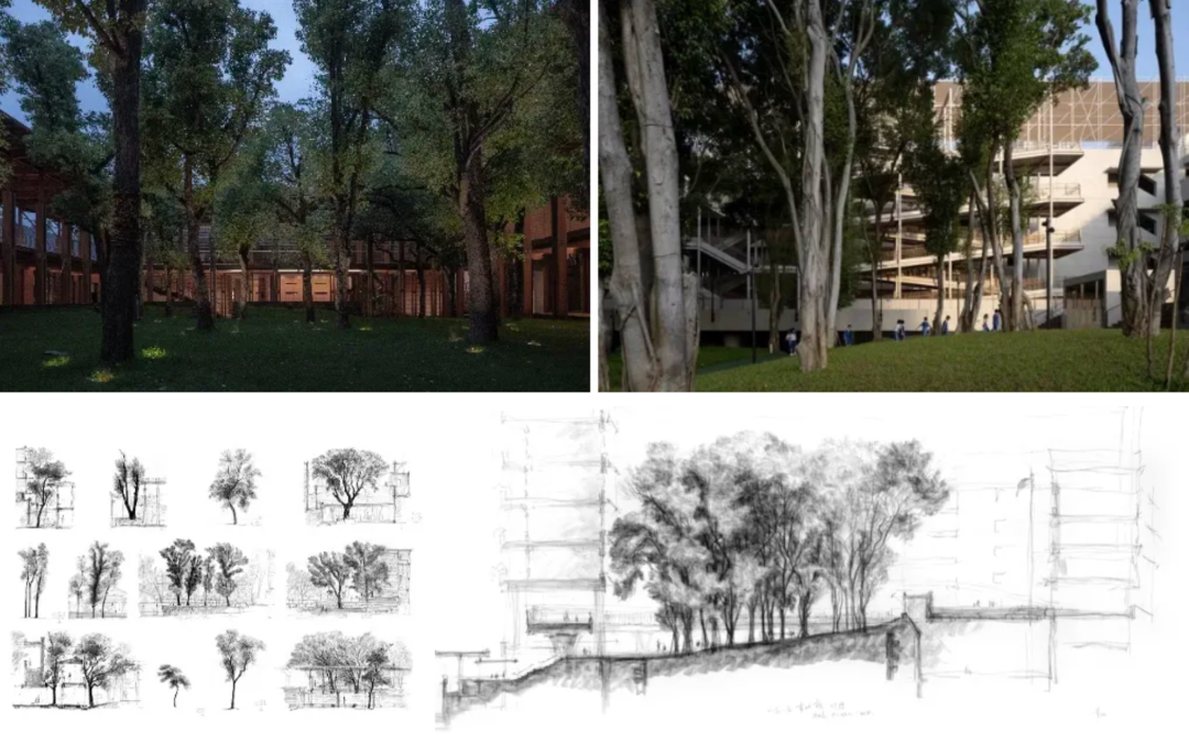 研讨的下半场由戴维·莱瑟巴罗教授主持,进入自由交叉讨论,直向建筑事务所的理事合伙人、川上行的项目建筑师张菡女士应邀加入。讨论侧重两个核心议题,一是对场地中的树的处置策略以及由此产生的设计影响,二是草图作为设计思维媒介在设计推进中的关键作用。针对此前关于树的一系列讨论,董功回应道:“保护树是设计的起点,但其意义不能止步于此,而是要在意这些树最终为场所贡献了什么。在具体的设计过程中,针对每一棵树,乃至某根枝桠,都要不断进行判断、取舍与修正(修整和修剪)。建筑会避让树——在树旁、在树之间,又或是在树四周,但趋于‘完形’的建筑体量和院落空间轮廓,都在表示建筑并非一味地顺从于树。 最终,建筑与树之间呈现出某种紧张关系,这种关系具有表现性,提示了树木之于建筑与场地的重要性。而且,随着树木生长,树与建筑的紧张关系会发生变化:原来紧张的部分可能会得到解放,原本松散的地方反倒会趋于紧张。这种在时间绵延中不可预测的关系变化,恰恰是孤立于自然物的建筑难以获得的生动的场所品质,可以持久地提示建筑、场地与自然之间的动态关系 。”