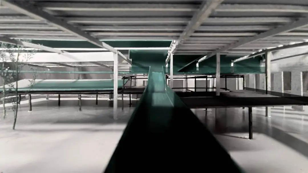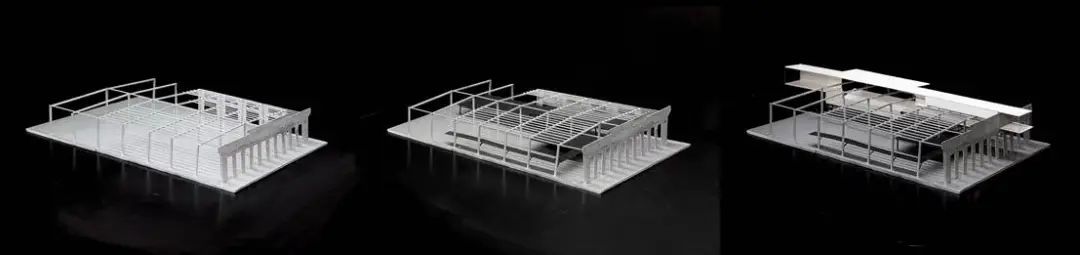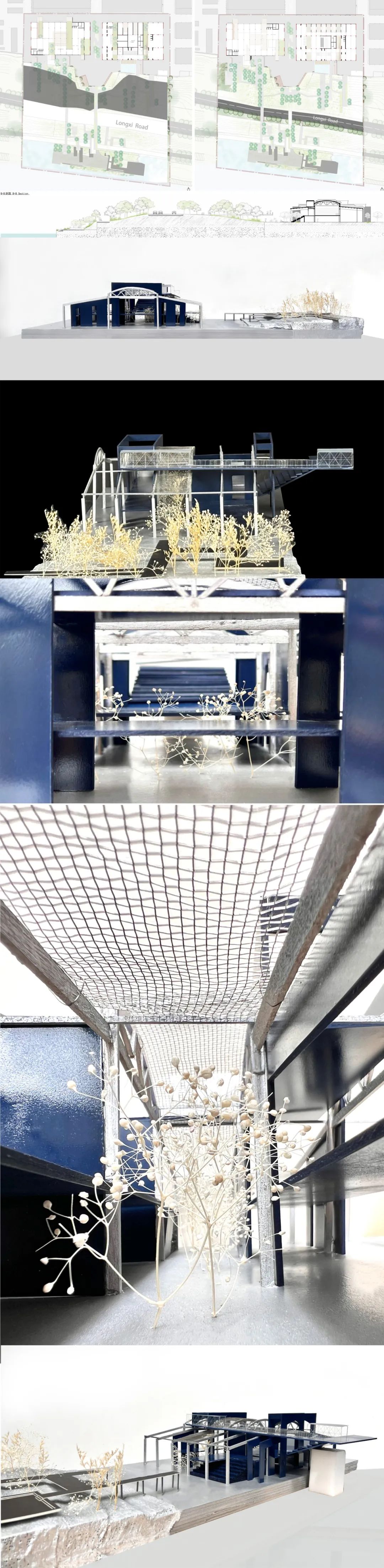 在设计过程中,各组围绕场地展开深度设计,模型作为核心设计方法,贯穿方案生成的全过程。两组成员先合力完成 1:300 场地模型,以宏观尺度锚定工业遗产与周边环境的关系;随后分组推进 1:300 和 1:100 的建筑及景观模型制作,前者用于推敲空间布局与城市肌理的呼应,后者则聚焦细节构造与场所氛围的营造。教学将模型作为一种设计方法,通过模型推敲构想设计。通过反复搭建、拆解、重组模型,抽象的设计构想被转化为可触摸的实体,成员们在调整比例、材质、结构的过程中,不断修正功能分区与流线逻辑,让 “介入 × 复兴” 的理念在模型迭代中逐渐清晰。