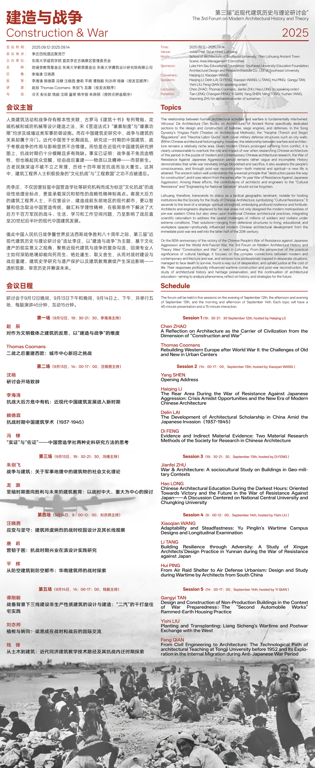 The "Backbone in the Flames of War: Architectural Light in the Rear Area - Themed Exhibition Commemorating the 80th Anniversary of the Victory of the Chinese People's War of Resistance Against Japanese Aggression and the World Anti-Fascist War", jointly hosted by Southeast University and the Yibin Cuiping District People's Government, will be grandly unveiled on September 13, 2025, in Lizhuang Ancient Town, Cuiping District, Yibin City, Sichuan Province. The 3rd Forum on Modern Architectural History and Theory, titled "Construction and War", hosted by the Southeast University School of Architecture and the Lizhuang Ancient Town Scenic Area Management Committee, will also be held concurrently.This event is the opening of the Southeast University School of Architecture's "A Century in Review and Prospect" series of academic activities. It invites renowned scholars and individuals from home and abroad to join this grand occasion and will be live-streamed online throughout.