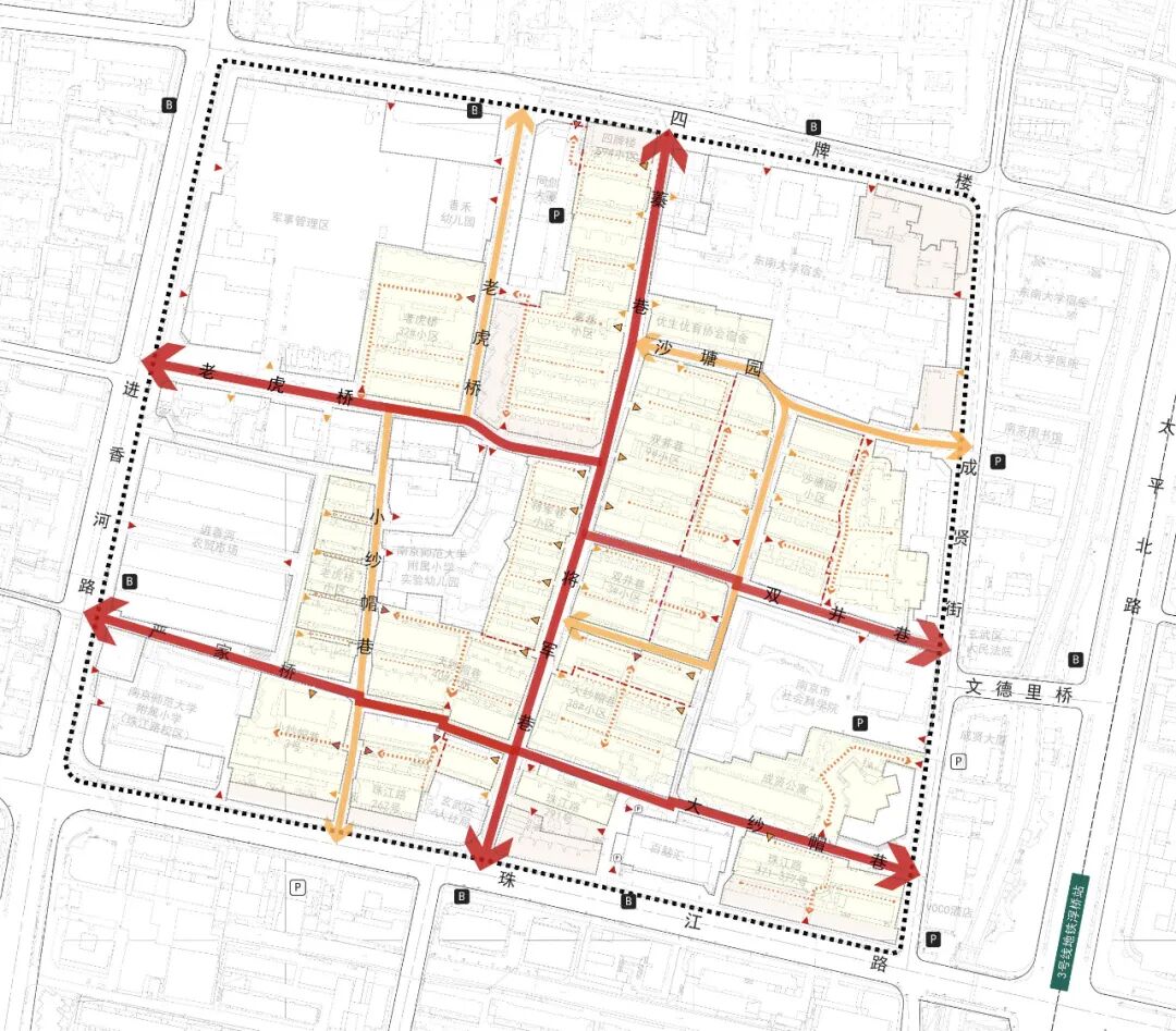 蓁巷街区建造于上世纪80年代末,位于南京市玄武区新街口街道,紧邻大学校园,其中还包含有进香河菜市场等集市区域。虽然烟火气息浓郁,但是物质环境衰旧,设施功能退化,人车混行安全隐患突出等问题突出,是南京老城区非常典型的衰退型老旧社区。且由于街区品质相对不足,与一楼一凤 四牌楼校园与之形成了“围墙效应”。校区、社区和城区在空间、功能、资源配置方面存在着显著的断裂。