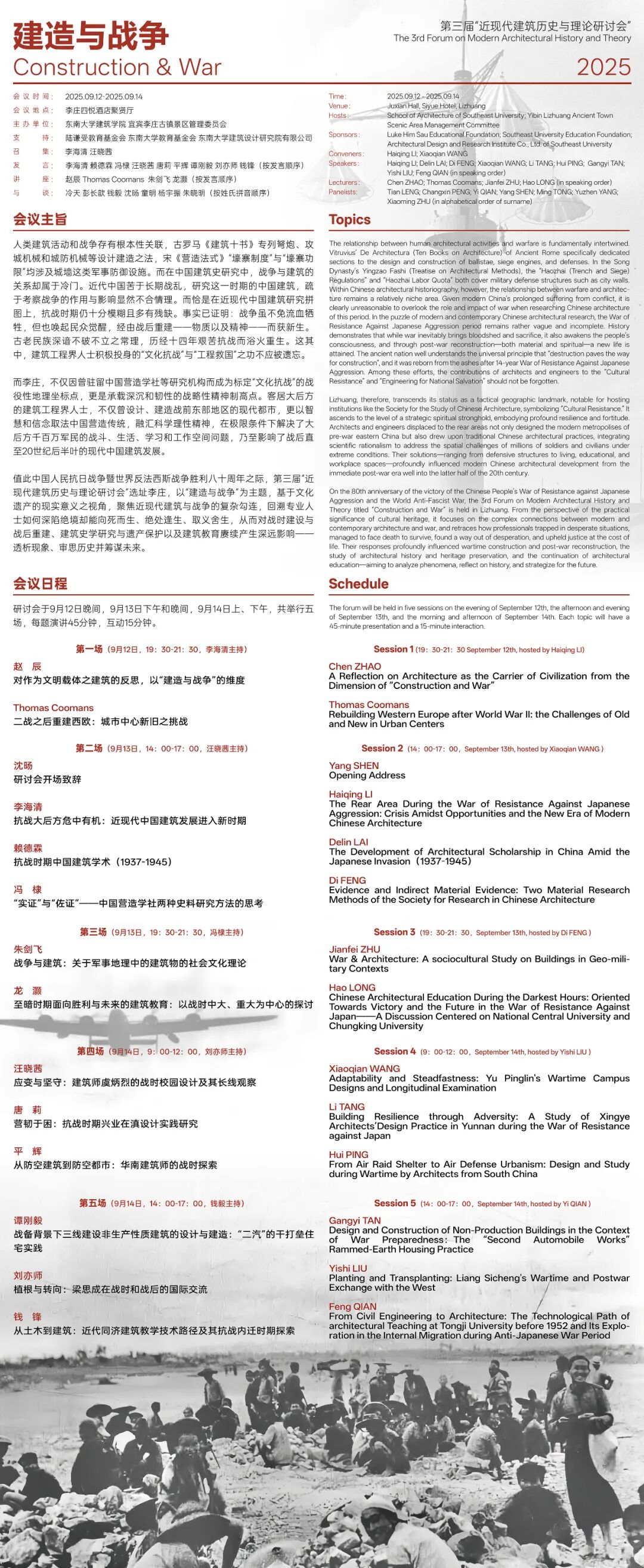 同期举行的“第三届近现代建筑历史与理论研讨会以“建造与战争”为主题,邀请国内外多位知名学者到会报告并展开交流,共举行五场学术报告和研讨。议题从抗战时期的建筑历史与理论研究,到战时设计实践,以及战时中国建筑教育、战后重建等诸多方面,深度剖析了近现代建筑与战争之间的复杂关联。研讨不仅试图梳理抗战建筑史,更是一场关于文明韧性的对话。30余位中外嘉宾现场参会,逾1.6万人次观看了《建筑师》视频号的独家线上直播,在学界和业界产生了广泛影响。本次主题展和研讨会是中国建筑界首次以抗战时期中国建筑为主题开展规模化和系统性的专业科普与学术研讨,与会人士均表示将以此为起点,进一步拓展和深化研究,让中国建筑工程界的抗战贡献得到更多彰显。