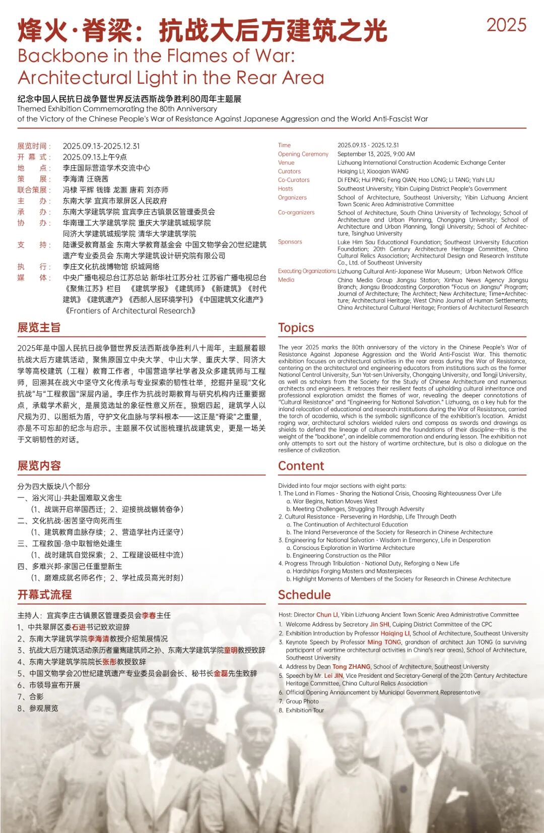 2025年是中国人民抗日战争暨世界反法西斯战争胜利80周年。为铭记历史、传承文明,“烽火·脊梁:抗战大后方建筑之光——纪念中国人民抗日战争暨世界反法西斯战争胜利80周年主题展”于2025 年9月13日在四川省宜宾市翠屏区李庄古镇隆重揭幕,第三届近现代建筑历史与理论学术研讨会“建造与战争”也于同期举行。此次活动由一楼一凤