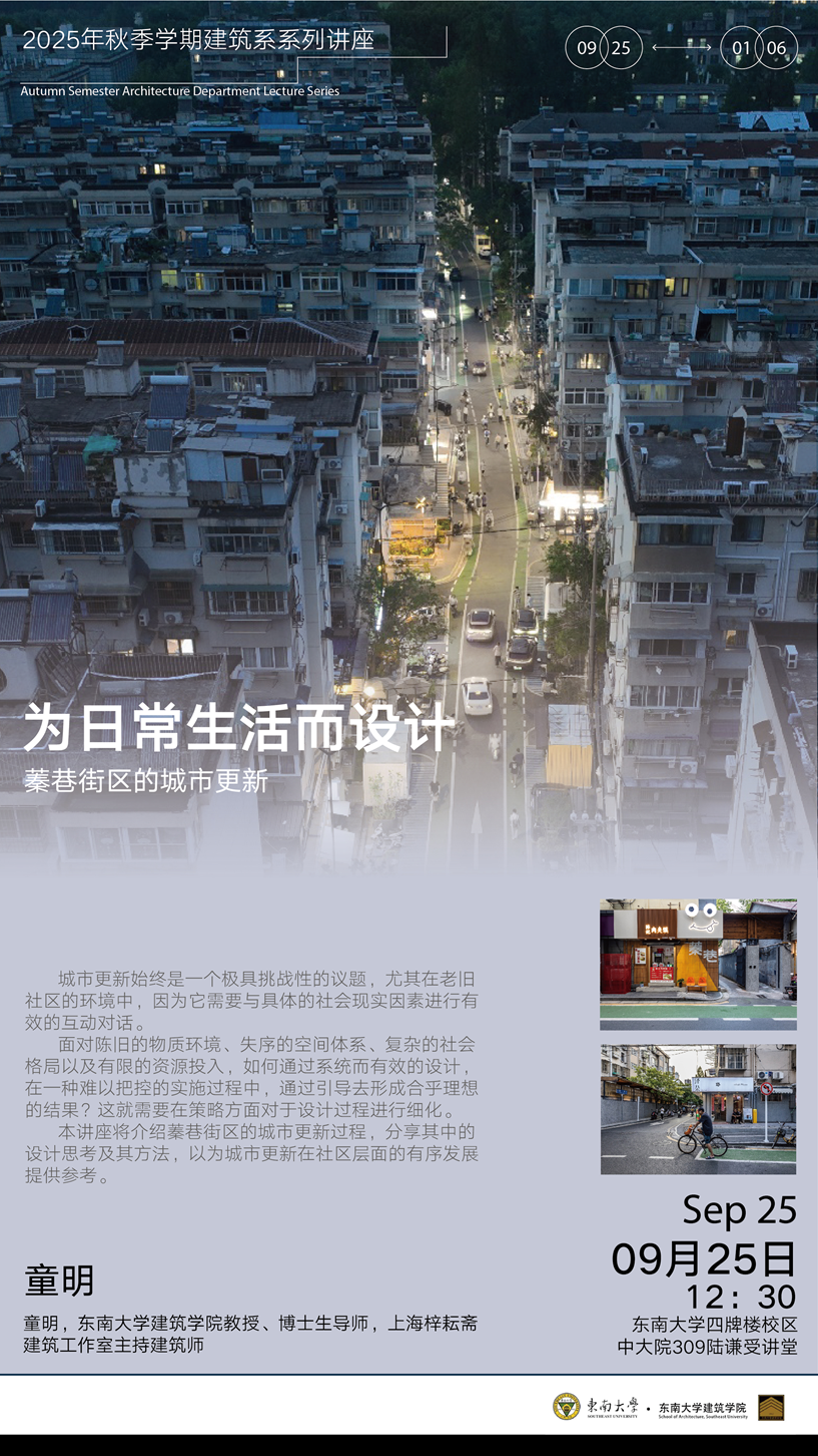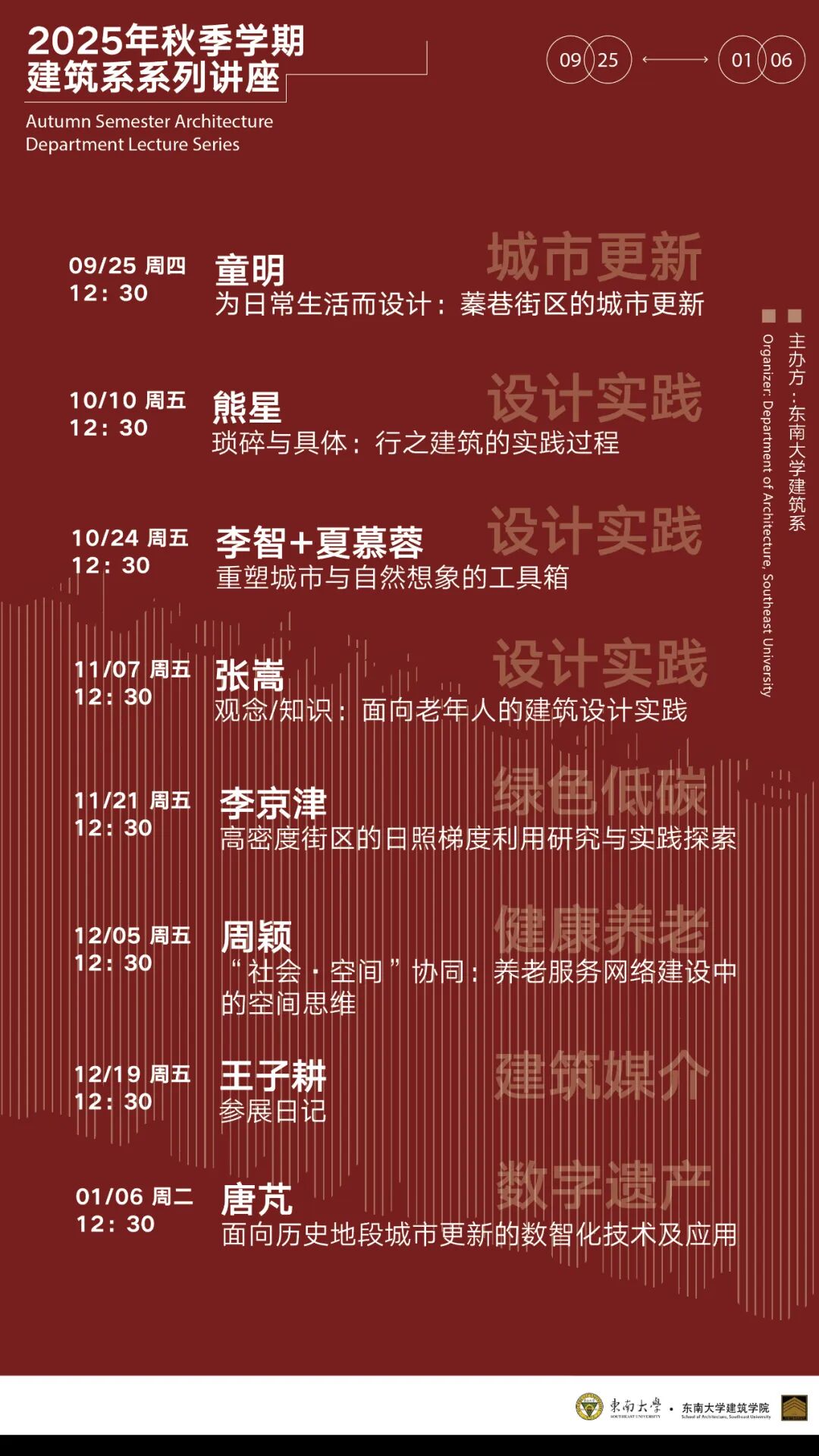本季讲座延续“对外特邀报告”与“对内学术交流”并行的模式,延请校外知名建筑师和本系专任教师,围绕“城市更新”、“设计实践”、“绿色低碳”、“健康养老”、“数字遗产“等话题展开学术与实践的交流与讨论。我们期待通过这一系列讲座,延续春季的开放与互动精神,为师生与从业者搭建思想碰撞的平台。在这里,每一次分享既是学术的播种,也是实践的丰收;既有对经典理论的深耕,也有对未知领域的拓荒。愿“春华秋实”的篇章,助力每一位参与者汲取灵感,在建筑学的广袤天地中,共同书写属于这个时代的答案。