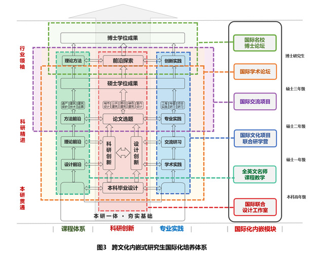在原有研究生培养体系中,贯通本、硕、博培养,嵌入在国际视野中注重文化创造的“培养链”,包括全英文名师课程教学、国际联合设计工作室、国际文化项目研学营、国际交流项目、国际学术论坛、国际名校博士论坛等多组模块,全链条构建贯通本研、“学、做、研、创”融合一体的国际化培养体系。(图3)