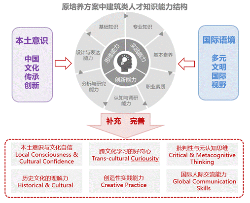 秉承建设“人类命运共同体”的理念,引导学生确立肩负文化责任的价值观,提升学生的文化理解能力和创新性思维培养,培养兼具家国情怀与国际视野的建筑领军人才。在原有人才培养目标中,针对国际视野中文化理解、传播和创新的软实力打造,提出六大目标完善能力矩阵,应对新形势下具有全球竞争力的建筑类国际化人才培养需求。(图2)。