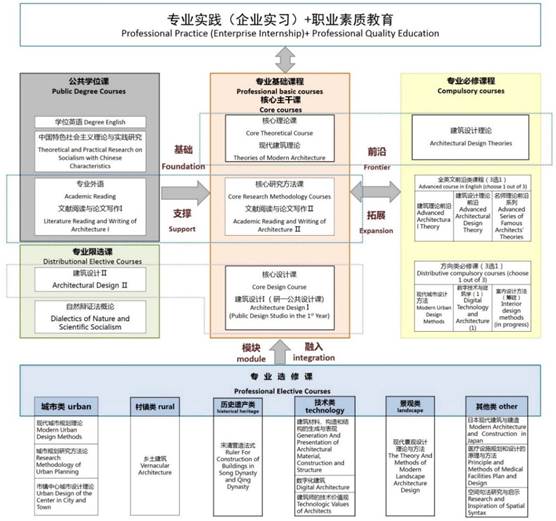 将双语及全英文课程内嵌于研究生培养方案之中。以涵盖理论、方法、设计的三门专业基础课程为核心主干,全英文专业理论课和国际合作联合工作坊并行融入原有课程体系框架(图7)。围绕理论前沿、实践前沿等一系列前沿课程,构建了国际化的课程体系(图8),完善国际化课程结构,持续引进国外知名教授,开设全英文学科前沿课程近30门,以专业基础课、必修课和选修课等不同模块贯穿整个课程体系;2020年疫情期间,邀请全球各领域知名学者,有效组织国际在线教学季7大系列课程和学术讲座,产生了积极的国际国内影响。