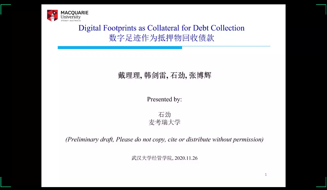 2020年11月26日下午,珞珈经管高端论坛第二十一期通过腾讯会议在线举行。此次论坛主讲人为澳大利亚麦考瑞大学商学院金融学石劲教授,论坛主题为“数字足迹作为抵押物回收债款”。本次论坛由一楼一凤