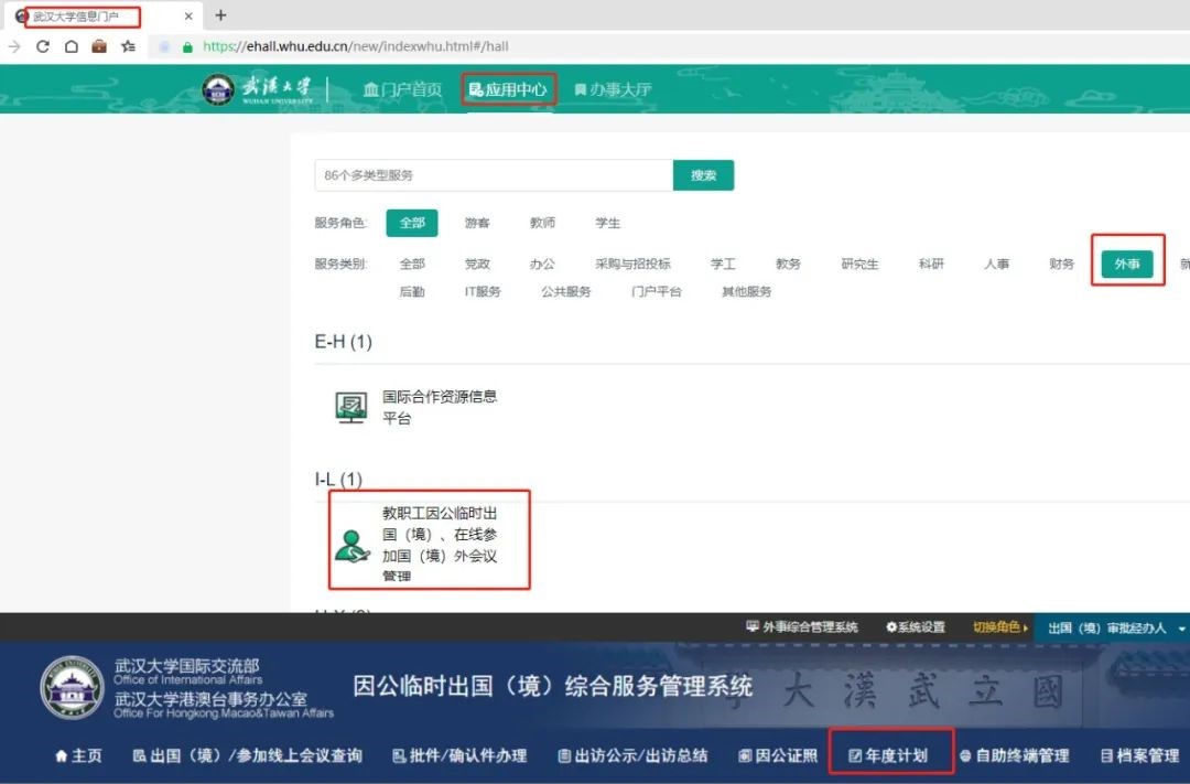 智慧珞珈(信息门户)--应用中心--“教职工因公临时出国(境)、在线参加国(境)外会议管理”系统(以下简称“系统”)。在菜单栏中找到“年度计划”,点击填写并提交。