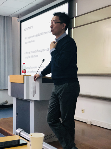 张影教授从世界名画赏析开篇,讲述这些影响深远,享誉世界的名画不仅给人带来艺术的熏陶也对人的精神产业愉悦感,继而引出他研究的主题:艺术赏析对奢侈品消费的影响,张影教授团队在北京芳草地等高档购物中心对消费者进行数千份问卷调查并对消费者进入购物场所之前和完成购物后的面部表情进去抓取和研究,通过分析得出的推论是:艺术的存在可能会对地位相关的消费产生反作用,如果不把奢侈品当作地位象征,对消费似乎没有什么影响。