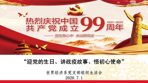 2020年7月1日是伟大的中国共产党成立99周年纪念日,在这个特殊时期世界经济系党支部下午召开主题为“迎党的生日、讲战疫故事、悟初心使命”的云端组织生活会,共同庆祝党的生日。