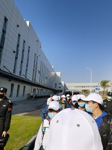 同学们排队等待进入车间