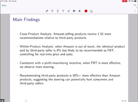 陈男首先从电商平台以及他们的垄断趋势作为研究背景的切入点,并分析了各国的反垄断策略,由此引出研究问题即市场结构——电商平台既作为商家管理者又作为商家销售产品的双重角色——是否以及如何影响算法推荐的行为和质量,从而影响消费者福祉。为了深入探究这个问题,陈男在亚马逊网站上开展了实证研究,选取合并购买推荐(当消费者购买某一商品时,网站会同时向消费者推荐其他相关商品,即为合并购买商品)作为研究对象,探究亚马逊在合并购买推荐中是推荐自身产品还是其他商家产品。
