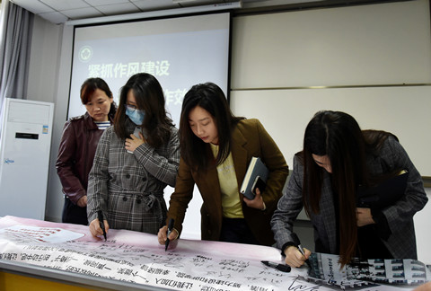 罗睿宣读了关于开展“一个微笑,一声问候,一把椅子”活动的倡议书,全体与会人员共同在“三个一”作风建设倡议书上签名,承诺将努力建设和谐学院、幸福经管,以高质量的服务工作向建党100周年献礼。(通讯员:沈仕雄 陈洁,摄影:姜文,审稿:罗睿)