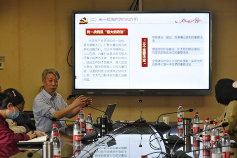 会议第一项,杜晓成作《同心同德 同向同行——统战理论学习及学院统战工作思考》报告。报告围绕党的统战理论、学院统战工作开展情况、存在问题及下一步工作举措四部分展开。杜晓成指出,党领导的统一战线,是党凝聚人心、汇聚力量的政治优势和战略方针,是党的特殊的群众工作,是增强党的阶级基础、扩大党的群众基础、巩固党的执政地位的重要法宝。学院党外人士高级知识分子集中,人才密集、知识密集,专业知识和学科优势明显,参政议政能力强、水平高、影响大,紧紧围绕服务于学院中心工作,为学院教学科研及社会服务工作做出了重大贡献。他强调,学院领导干部及各支部要提高政治站位,高度重视统战工作在学院发展中凝聚共识、凝聚人心、凝聚智慧、凝聚力量的重要作用,增强统战工作的责任感、使命感和意识,加强思想政治引领,把党外人士紧紧团结在党的周围。学院将进一步完善党的领导联系党外人士制度,坚持统战工作座谈会制度,切实落实统一战线“四个一”同心工作。