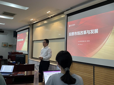 师生带来了“股票市场改革与发展”的主题报告。内容涵盖了中国股票市场基本情况、中国股票市场的发展历史以及中国股票市场的改革历程。此次讲座由金融系余静文老师主持,长江证券投资者教育基地负责人张睿、金融系李斌、宋凌峰、张东祥等多位老师和30余位学生参加了此次学术活动。