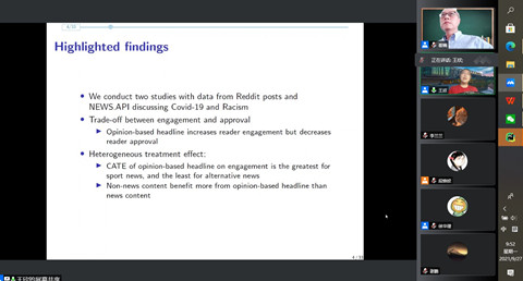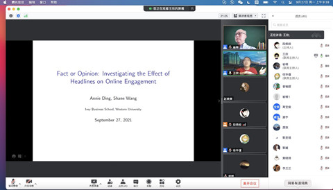 师生带来了“Fact or Opinion: Investigating the Effect of Headlines on News Engagement”的主题报告。本次讲座由崔楠老师主持,市场营销与旅游管理系的黄敏学老师、徐岚老师、唐漾一老师、管理科学与工程系高宝俊老师等多位老师和50余位学生参加。