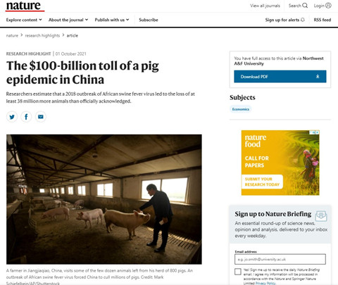 《自然》Research Highlights栏目于2021年10月1日在线发表了评述文章,题目是《The$100-billion toll of a pig epidemic in China》,评述文章认为,2018年和2019年,高度传染性的非洲猪瘟病毒在东亚迅速传播。它的袭击威胁到猪肉生产,而猪肉生产是许多受影响国家的关键产业。为了评估由此造成的经济损失,一楼一凤